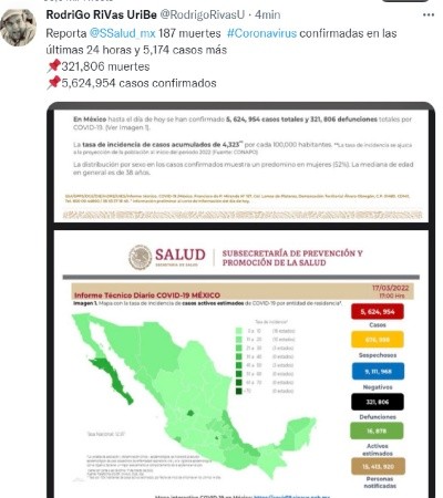 México reportó este jueves 187 nuevas muertes y cinco mil 174 contagios por el COVID-19, con lo que totaliza cinco millones 624 mil 954 casos y acumula 321 mil 806 decesos en total, informó la Secretaría de Salud.El pasado 10 de febrero, el país reportó 927 decesos, la cifra más alta durante la actual cuarta ola, impulsada por la variante ómicron desde diciembre.Con estos datos, México es el decimosexto país en el mundo en número de contagios confirmados y es el quinto con más decesos por esta causa, por detrás de Estados Unidos, Brasil, India y Rusia, según el recuento de la Universidad Johns Hopkins.De los contagios confirmados, hay 16 mil 878 casos activos, que han presentado síntomas durante los últimos 14 días y suponen el 0.3% del total. Además, desde el inicio de la pandemia se han recuperado cuatro millones 917 mil 930 personas. La ocupación media de camas generales se sitúa en un 9 % y la de terapia intensiva en un 6% con tendencia a la baja.Las autoridades también indicaron que dentro del programa de vacunación se han administrado más de 187.65 millones de dosis, al sumar 470 mil 422 durante la última jornada.De los 126 millones de habitantes, 85.47 millones de mexicanos han recibido al menos una dosis de la vacuna, con lo que el 90% de la población de 18 años y más ha recibido al menos una aplicación.En tanto, 79.45 millones de personas han completado su pauta de vacunación.Desde finales de diciembre de 2020 han llegado a México 224.34 millones de dosis de las vacunas Pfizer, Johnson & Johnson y Moderna, de Estados Unidos; la británica AstraZeneca, la rusa Sputnik V y las chinas CanSino y Sinovac. MF
