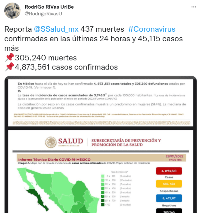 México registró este viernes 45 mil 115 nuevos contagios de COVID-19 para llegar a un total de cuatro millones 873 mil 561 casos, además de 437 muertes para totalizar 305 mil 240 decesos, informó la Secretaría de Salud.La pasada semana, México reportó sus cifras más altas de contagios, con un récord histórico de 60 mil 552 el 19 de enero, además de muertes diarias por encima de las 300.Con estos datos, México es el decimocuarto país en el mundo en número de contagios confirmados y es el quinto con más decesos por esta causa, por detrás de Estados Unidos, Brasil, India y Rusia, según el recuento de la Universidad Johns Hopkins.Las autoridades sanitarias reconocen que, con base en las actas de defunción, el país puede rozar los 455 mil fallecimientos y estiman que México acumula en realidad cinco millones 132 mil 305 contagios.De los contagios confirmados, hay 301 mil 378 casos activos, que han presentado síntomas durante los últimos 14 días y suponen el 5.9% del total.Además, desde el inicio de la pandemia se han recuperado tres millones 940 mil 328 personas.La ocupación media de camas generales se sitúa en un 46% y la de terapia intensiva en un 29%.Las autoridades también indicaron que dentro del programa de vacunación se han administrado casi 164.84 millones de dosis, al sumar un millón 36 mil 538 durante la última jornada.El Gobierno de México afirma que es el séptimo país que más dosis ha aplicado en números absolutos.De los 126 millones de habitantes, 83.51 millones en el país han recibido al menos una dosis de la vacuna, con lo que 89% de la población de 18 años y más han recibido al menos una dosis.En tanto, 76.94 millones han completado su esquema de vacunación.MF