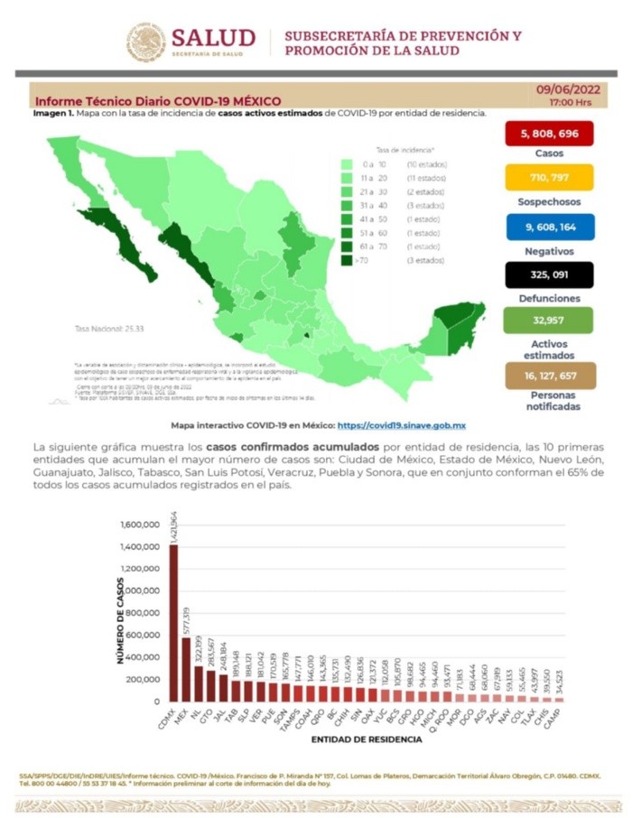 La Secretaría de Salud (Ssa) reportó seis mil 024 nuevos contagios de COVID, por lo que en total se acumulan cinco millones 808 mil 696 casos desde que inició la pandemia en México.Además, la dependencia informó que al corte de este jueves hubo 36 muertos por la enfermedad, por lo que el total de decesos subió a 325 mil 091.La dependencia detalló que la distribución por sexo en las defunciones confirmadas muestra un predominio del 62% en hombres. La mediana de edad en las muertes es de 64 años.Además, la Ssa expuso que las 10 primeras entidades que acumulan el mayor número de casos son: Ciudad de México, Estado de México, Nuevo León, Guanajuato, Jalisco, Tabasco, San Luis Potosí, Veracruz, Puebla y Sonora, que en conjunto conforman el 65% de todos los casos acumulados registrados en el país.JM