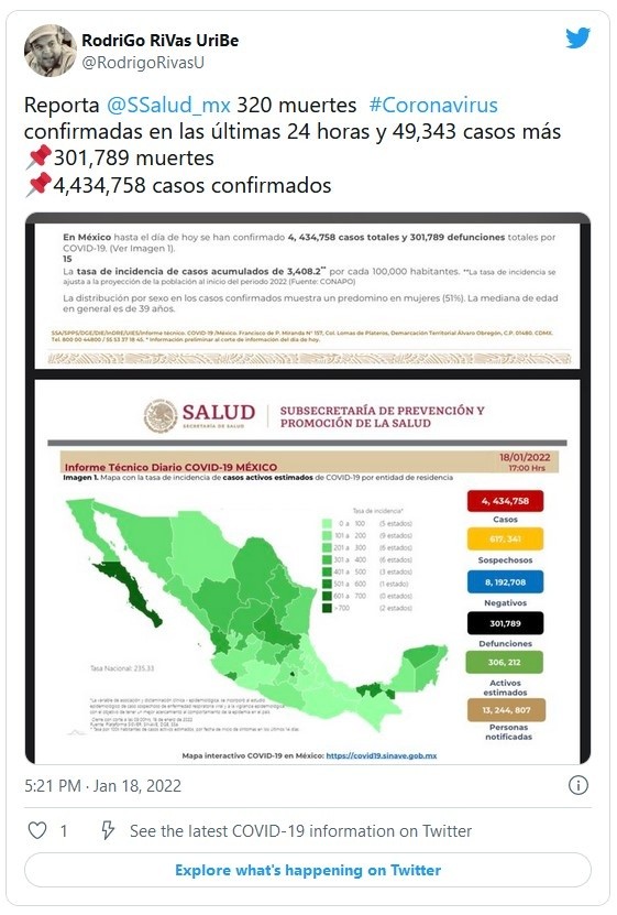 La Secretaría de Salud informó la tarde de este martes que México registró en 24 horas un total de 49 mil 343 contagios nuevos de COVID-19, así como 320 defunciones.Los números totales en su reporte técnico diario son de cuatro millones 434 mil 758 casos y 301 mil 789 defunciones. Además, los casos activos estimados son 306 mil 212.El número previo que se tenía como máximo era de 47 mil 113 contagios, registrado el sábado.A su vez, la dependencia reportó 156 millones 419 mil dosis de vacunas aplicadas, y de ellas 75 millones de personas con esquema completo.Hoy por la mañana, el subsecretario de Prevención y Promoción de la Salud, Hugo López–Gatell Ramírez, informó que los tratamientos contra el COVID-19 que recién fueron aprobados por la Comisión Federal para la Protección contra Riesgos Sanitarios (Cofepris) no podrán comercializarse, sino que su adquisición y distribución estarán a cargo del Estado por tratarse de fármacos aprobados para su uso de emergencia.El funcionario recordó que en su momento así se hizo con el fármaco remdesivir, y con todas las vacunas que se han aplicado en más de 82 millones de personas, por lo que el uso de paxlovid y molnupiravir está bajo la tutela del Estado.JM