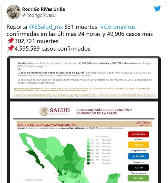 México registró este viernes 49 mil 906 nuevos contagios de COVID-19 para un total de cuatro millones 595 mil 589 casos, además de 331 muertes para llegar a 302 mil 721 decesos totales, informó la Secretaría de Salud.De la cifra de casos confirmados, hay 353 mil 885 activos, que han presentado síntomas durante los últimos 14 días y suponen el 7.1 % del total. Además, desde el inicio de la pandemia se han recuperado tres millones 621 mil 133 personas.La ocupación media de camas generales se sitúa en un 39 % y el uso de camas de terapia intensiva en un 23 por ciento.A partir del próximo lunes 24 de enero y hasta el 6 de febrero, 12 de los 32 estados del país estarán en semáforo de riesgo epidemiológico en color verde (riesgo bajo de contagios), 10 estarán en color amarillo (riesgo medio), entre ellos la Ciudad de México; nueve en naranja (riesgo alto) y uno en rojo (máximo riesgo).Las autoridades también indicaron que dentro del programa de vacunación se han administrado 158.65 millones de dosis, al sumar 780 mil 913 durante la última jornada.De sus 126 millones de habitantes, 83.15 millones en el país tienen al menos una dosis de la vacuna. En tanto, 76.34 millones ha completado su esquema de vacunación.JM