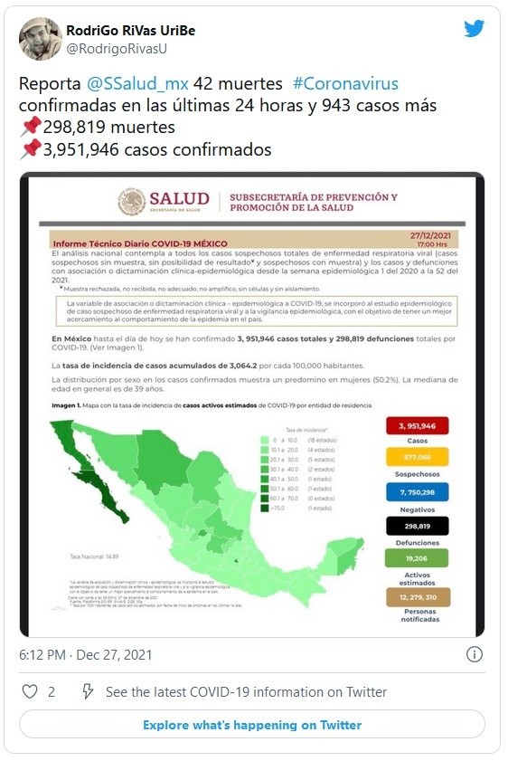 Este lunes, la Secretaría de Salud informó que México registró este lunes 42 muertes por COVID-19 para llegar a 298 mil 777 decesos totales y 943 nuevos contagios para un total de tres millones 951 mil 946 casos.De la cifra de casos totales, hay 19 mil 206 activos, que han presentado síntomas durante los últimos 14 días. Además, desde el inicio de la pandemia se han recuperado tres millones 302 mil 873 personas.La ocupación media de camas generales se sitúa en un 13 % y el uso de camas de terapia intensiva en un 11 por ciento.México detectó a la primera persona contagiada con la variante ómicron el 3 de diciembre y desde entonces suman más de 40 casos confirmados por los gobiernos de Ciudad de México, Estado de México, Nuevo León y Sinaloa.Las autoridades también indicaron que dentro del programa de vacunación se han aplicado 148.5 millones de dosis, al sumar 787 durante la última jornada.De los 126 millones de habitantes que tiene México, 81.9 millones tienen al menos una dosis de la vacuna, es decir, el 87 % del total de la población mayor de edad. De ese total, el 89 % (72.69 millones) ha completado su esquema de vacunación.JM