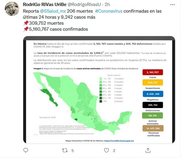 México registró este lunes nueve mil 242 nuevos contagios de COVID para llegar a un total de cinco millones 160 mil 767 casos, además de 206 muertes para totalizar 309 mil 752 decesos, informó la Secretaría de Salud.Las autoridades sanitarias reconocen que, con base en las actas de defunción, el país puede rozar los 460 mil fallecimientos y estiman que México acumula en realidad cinco millones 426 mil 856 contagios.De los contagios confirmados, hay 156 mil 916 casos activos, que han presentado síntomas durante los últimos 14 días y suponen el 2.9 % del total; además, desde el inicio de la pandemia se han recuperado cuatro millones 348 mil 148 personas.La ocupación media de camas generales en hospitales mexicanos se sitúa en un 40 % y la de terapia intensiva en un 26 por ciento.Las autoridades también indicaron que dentro del programa de vacunación se han administrado más de 169.68 millones de dosis, al sumar 53 mil 402 durante la última jornada.De los 126 millones de habitantes, 83.9 millones de mexicanos han recibido al menos una dosis de la vacuna, con lo que 89 % de la población de 18 años y más han recibido al menos una aplicación. En tanto, 77.61 millones han completado su esquema de vacunación.JM