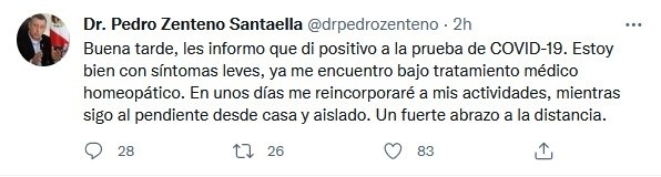 A través de sus redes sociales, el director general del Instituto de Seguridad y Servicios Sociales de los Trabajadores del Estado (ISSSTE), Pedro Zenteno Santaella, informó su contagio de COVID."Buenas tardes, les informo que di positivo a la prueba PCR de #COVID19. Me encuentro con síntomas leves y bajo tratamiento médico homeopático. Estaré trabajando desde casa y aislado, confío reincorporarme muy pronto a mis actividades al frente del #ISSSTE. Continuemos cuidándonos y siguiendo las recomendaciones de salud. ¡Un fuerte abrazo a la distancia!", escribió en sus redes.Hace dos semanas, el funcionario federal llamó a la población a extremar medidas de prevención ante el alto índice de contagios del virus."Se recomienda, de haber existido contacto con persona positiva a COVID-19, mantenerse atentos a los signos de alarma principalmente, los niveles de saturación de oxígeno (SpO2) en la sangre menor a 90 puntos y fiebre; en caso de presentar síntomas de COVID-19, la persona debe aislarse por al menos siete días y estar pendiente de la evolución de la enfermedad para solicitar atención médica de ser necesario", dijo.JM