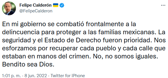 Después de que el Presidente Andrés Manuel López Obrador insinuó que Felipe Calderón tuvo vínculos con la delincuencia organizada, el exmandatario de México le respondió y dijo que en su gobierno se combatió frontalmente al crimen para proteger a las familias mexicanas.A través de redes sociales, Felipe Calderón dijo que en su administración la seguridad y el Estado de Derecho fueron prioridad, además que se esforzaron por recuperar cada pueblo y cada calle que estaban en manos del crimen."En mi gobierno se combatió frontalmente a la delincuencia para proteger a las familias mexicanas. La seguridad y el Estado de Derecho fueron prioridad. Nos esforzamos por recuperar cada pueblo y cada calle que estaban en manos del crimen. No, no somos iguales. Bendito sea Dios", escribió Calderón.En su conferencia "mañanera" de este miércoles en Palacio Nacional, López Obrador respondió a los legisladores de Estados Unidos, Ted Cruz y Marco Rubio, sus afirmaciones que, además de apoyar a dictadores, también tenía vínculos con el crimen organizado, por lo que les exigió pruebas y remató que él no es Felipe Calderón."El año pasado, creo que le dieron como 120 mil dólares, la fundación esta llamada la Asociación Nacional del Rifle, pero estos son republicanos, estos dos; también un demócrata, señor Meléndez, que fue el que prácticamente amenazó de que no iba a votar a favor de las iniciativas del presidente Biden si se invita a todos los países de América a la llamada Cumbre de las Américas (…)"."Entonces esa es la respuesta: ¿Cuál es mi vinculación con el narcotráfico en México? Yo no soy Felipe Calderón", declaró López Obrador.OA