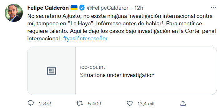 Luego de que el secretario de Gobernación, Adán Augusto López, reiterara que hay una investigación internacional en contra de Felipe Calderón por el operativo "Rápido y Furioso", y este martes, el mismo expresidente aclaró que no existe ningún proceso en la Corte Penal Internacional de La Haya.A través de su cuenta de Twitter, Felipe Calderón refutó a Adán Augusto y escribió lo siguiente: "No secretario Augusto, no existe ninguna investigación internacional contra mí, tampoco en La Haya"."Infórmese antes de hablar, para mentir se requiere talento. Aquí le dejo los casos bajo investigación en la Corte penal internacional", agregó y remató con la frase: " Ya siéntese señor", agregó después.La víspera y ante el Congreso de Oaxaca, el titular de la Segob refirió el operativo "Rápido y Furioso", mediante el cual se introdujeron armas con el aval de los gobiernos de Estados Unidos y México a nuestro país y que llegaron a manos del crimen organizado."La denuncia fue presentada en la Fiscalía General de la Corte Penal Internacional y sabemos que está en periodo de integración, están alegando todas las puertas necesarias. Seguramente va a haber justicia en eso", afirmó Adán Augusto López.GC