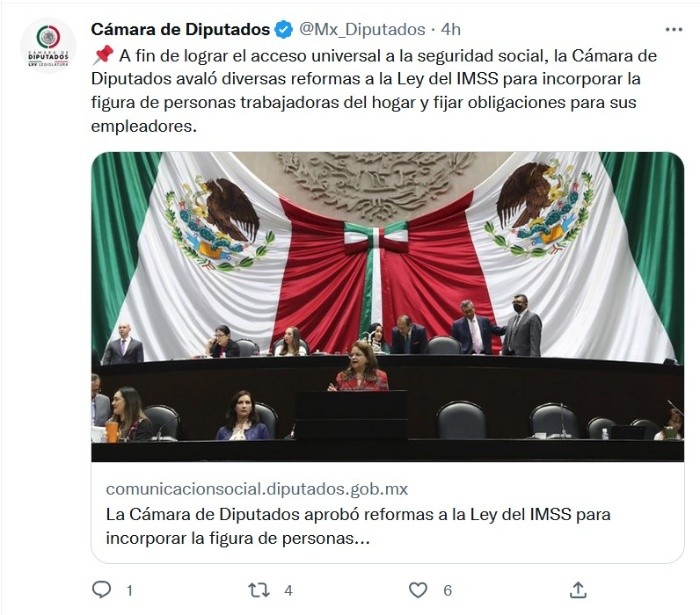 La Cámara de Diputados aprobó, con 486 votos a favor, ninguno en contra y una abstención, una reforma para incluir en la Ley del Instituto Mexicano del Seguro Social (IMSS), la definición de personas trabajadoras del hogar y obligar a los patrones inscribir a sus empleados a ese servicio.El dictamen establece que la persona empleadora tendrá la obligación de realizar las cuotas obrero patronales correspondientes, a fin de que sus empleados cuenten con seguro médico y todos los beneficios que implica ser derechohabiente del IMSS.La reforma también señala que el aseguramiento de las personas trabajadoras del hogar termina cuando concluya la relación laboral.Al fundamentar el dictamen, la presidenta de la Comisión de Seguridad Social, diputada Ivonne Cisneros Luján (Morena), explicó que estas reformas representan un paso importante para lograr el acceso universal a la seguridad social, porque sienta las bases normativas para incorporar a "un sector de personas trabajadoras que históricamente habían sido discriminadas e invisibilizadas en la ley y que representan alrededor de 2.2 millones, de las cuales, más del 80 por ciento son mujeres".Detalló que se adiciona un capítulo, a través del cual se define quiénes son y quiénes no son personas trabajadoras del hogar; además, se establece la obligación de las personas empleadoras de registrarlas y de cubrir las cuotas obrero-patronales, y se definen los mecanismos para cumplir con dichas obligaciones.Resaltó que al ser reconocidas las personas trabajadoras del hogar como sujetas de aseguramiento obligatorio, tendrán derecho a los cinco seguros que la Ley del Seguro Social prevé: de enfermedad y maternidad; de riesgos de trabajo; de invalidez y vida; de retiro, cesantía en edad avanzada y vejez y el seguro de guarderías y prestaciones sociales.La diputada Taygete Irisay Rodríguez González (MC) subrayó que las y los trabajadores del hogar son mujeres y hombres que por años han pertenecido a los grupos más vulnerables de todo nuestro país, sin derechos laborales, sin seguridad social y sin jubilación digna."Hoy podemos cambiar la realidad de estas personas que, además, en su mayoría sufren de discriminación por falta de educación y de condiciones formales". Destacó que en su grupo parlamentario se proclaman a favor de este dictamen porque "apostamos a un país de iguales, donde todos podamos tener los mismos derechos y oportunidades sin distinción alguna", expresó.Del PRI, el diputado Juan Francisco Espinoza Eguia indicó que con el dictamen se crea un marco jurídico sólido que fortalece y amplía el sistema de seguridad social en nuestro país. Estimó que se suman los esfuerzos para lograr que hoy México avance hacia la conformación de un Estado más igualitario y garante de derechos."Hoy legislamos para brindar justicia social a quienes por mucho tiempo han estado relegados. México es un país grande en desigualdades y de muchas injusticias, nuestra responsabilidad es construir leyes que permitan garantizar el bienestar y la paz de todas y todos los mexicanos", comentó.JM