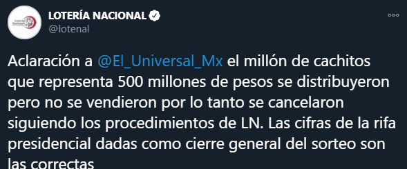 Luego de se detectara la diferencia de un millón de billetes de lotería de la rifa del avión presidencial, entre lo que dijo el Presidente Andrés Manuel López Obrador el pasado 17 de septiembre y un informe de la directora de la Lotería Nacional, dicha dependencia intentó aclarar lo sucedido.La Lotería Nacional informó que el poco más de millón de cachitos en efecto se distribuyeron, pero no se vendieron por lo tanto se cancelaron siguiendo los procedimientos de la institución.De haberse vendido, esta cantidad de boletos hubiera representado un ingreso de unos 500 millones de pesos.Sin embargo, no aclaró por qué el pasado 17 de septiembre, dos días después de la rifa, el entonces titular de la dependencia Ernesto Prieto Ortega informó que se vendieron 4 millones 685 mil 800 cachitos, para una venta total de 2 mil 342 millones 900 mil pesos por el sorteo.Ayer viernes, en la conferencia mañanera del Presidente Andrés Manuel López Obrador, la actual directora de la Lotería Nacional, Margarita González Saravia ofreció cifras diferentes con respecto al gran sorteo especial 235 en el cual se rifó el valor del avión presidencial TP01.La funcionaria informó que se vendieron 3 millones 647 mil 353 cachitos (billetes), a 500 pesos cada uno, por lo que se obtuvieron mil 823 millones 676 mil 500 pesos.Es decir, que la diferencia entre un reporte y otro es de un millón 38 mil 447 boletos vendidos, mientras que la diferencia de recursos obtenidos es de 519 millones 223 mil 500 pesos.