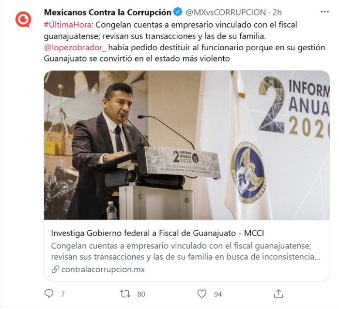 De acuerdo con una investigación publicada por Mexicanos contra la Corrupción y la Impunidad (MCCI), el Gobierno federal inició una investigación contra Carlos Zamarripa, fiscal de Guanajuato, "en cuya gestión ese estado se convirtió en el más violento del país por la disputa entre cárteles de la droga".El texto de Raúl Olmos refiere que las autoridades han rastreado las transacciones bancarias de Carlos Zamarripa y de su círculo cercano, y derivado de esa investigación, la Unidad de Inteligencia Financiera (UIF), a cargo de Santiago Nieto, "ya procedió al congelamiento de cuentas de un empresario supuestamente vinculado con el fiscal".Cabe señalar que en distintas mañaneras, el Presidente Andrés Manuel López Obrador (AMLO) ha criticado la violencia en Guanajuato y el actuar del fiscal Zamarripa, de quien ha pedido su destitución por malos manejos en el combate a la delincuencia.Tan sólo el 26 de julio pasado, AMLO llamó a remover a Carlos Zamarripa, pues señaló que lleva en el cargo 11 años y el índice de violencia aumenta en la entidad."Entonces ya no se puede andar con contemplaciones cuando se trata de la seguridad de la gente. Aquí no debe de prevalecer el amiguismo, el influyentismo, nada de esas lacras de la política, se tiene que remover, puede ser muy cercano, compañero del partido, de escuela, pero si no se dan resultados y si esta de por medio la vida de la agente, para afuera. Si alguien trabaja en una empresa y no da resultados, ni modo que lo van a mantener ahí como gerente, lo quitan, con más razón cuando se trata de un servidor público", expresó en ese entonces AMLO.El Gobierno federal inició una investigación sobre el fiscal de Guanajuato, Carlos Zamarripa, en cuya gestión ese estado se convirtió en el más violento del país por la disputa entre cárteles de la droga.Las autoridades federales han rastreado las transacciones bancarias de Zamarripa y de su círculo cercano, y derivado de esa investigación, la Unidad de Inteligencia Financiera (UIF) ya procedió al congelamiento de cuentas de un empresario supuestamente vinculado con el fiscal.El Presidente de México, Andrés Manuel López Obrador, ha criticado en forma reiterada la actuación del Fiscal guanajuatense, quien tiene 12 años en el cargo, y le ha solicitado al gobernador Diego Sinhué Rodríguez que lo destituya por los malos resultados en combate a la delincuencia."Guanajuato es de los estados con más violencia y desde hace ya bastante tiempo y no es posible que no haya ninguna mejora sobre todo en el caso de homicidios y lleve 12 años el procurador de Guanajuato. No es posible. Si fuese gerente de una empresa, con esos resultados, ya lo hubiesen corrido", dijo López Obrador el pasado 16 de julio."De manera abierta y respetuosa he estado señalando esto de Guanajuato porque no me puedo quedar callado, sería complicidad", reiteró el 26 de julio, al insistir en la necesidad de remover al fiscal de aquella entidad.A la par de esos exhortos del Presidente, el Gobierno federal inició una investigación sobre el Fiscal de Guanajuato.En el expediente del caso, al cual tuvo acceso Mexicanos contra la Corrupción y la Impunidad (MCCI) aparece una revisión detallada de los ingresos que el fiscal obtuvo a partir del año 2012, así como sus gastos tanto en el país como en el extranjero. Al no encontrarse inconsistencias relevantes, la investigación se amplió a su círculo cercano, incluida la esposa que se desempeña como juez en el Poder Judicial del Estado, así como empresarios que se presume han colaborado con Zamarripa como posibles operadores financieros.La investigación incluyó a Luis Ernesto Ayala Torres, quien hasta marzo del presente año se desempeñaba como secretario del Gobierno de Guanajuato.Uno de los elementos que llevaron a investigar a Ayala Torres fue la venta que realizó de su empresa familiar, Botas San Diego, al empresario Francisco Isidro González Espejel, quien –según la información de inteligencia registrada en el expediente- podría tener vínculos con el fiscal guanajuatense.Las autoridades federales recopilaron información de esa transacción comercial, así como de otras empresas en las que ha tenido participación González Espejel como accionista o representante legal a partir del año 2014. En una comercializadora del empresario, los analistas de la UIF detectaron la dispersión de fondos a "operadores pitufos", es decir, múltiples transacciones en montos pequeños, lo cual –en consideración de la autoridad- es un indicio de posible lavado de dinero o evasión fiscal.En la tipología de lavado de dinero de la UIF, los "pitufos" materializan operaciones en efectivo, en beneficio de un tercero o terceros de forma fraccionada en diversas operaciones para, posteriormente concentrar los recursos.Este fue uno de los argumentos de la UIF para solicitar el congelamiento de cuentas bancarias del empresario, quien promovió un juicio de amparo por considerar injusta la intervención de las autoridades.Sobre este amparo contra la UIF se abrió el expediente 245/2020 ante el juzgado séptimo de distrito en Guanajuato.Si te interesó esta noticia y quieres saber más, entonces descarga y descubre INFORMAPlus, la aplicación digital de EL INFORMADOR, en donde tenemos contenidos exclusivos, seleccionados por nuestros editores, para darles una experiencia más completa a los lectores. Si eres suscriptor de EL INFORMADOR tu acceso está incluido, solicítalo al 33 3678-7777Descarga la aplicación y pruébala GRATIS por treinta días.Para iOS: https://apple.co/35jaVgbPara Android: https://bit.ly/3gwVSEVJM