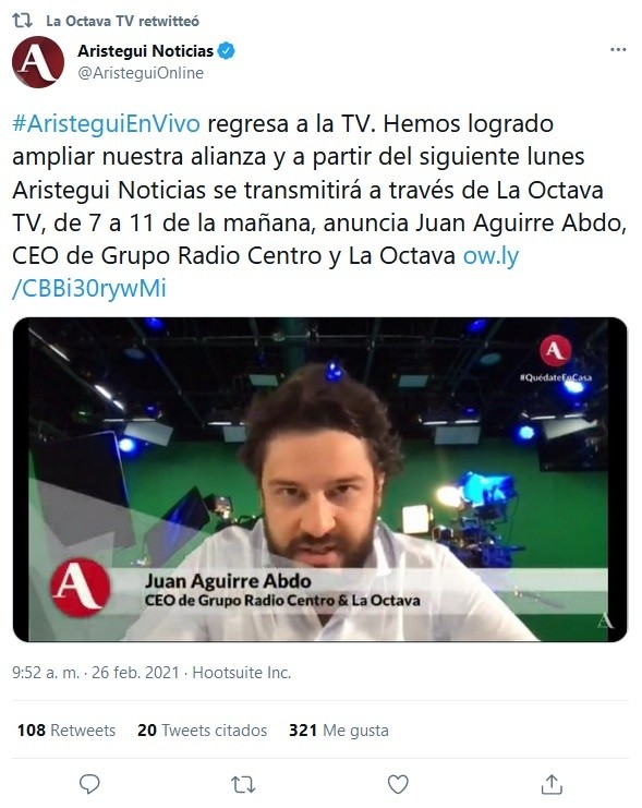Carmen Aristegui regresa a la televisión abierta en el Canal La Octava de Grupo Radio Centro (GRC) a partir del 1 de marzo próximo.Aristegui Noticias estará en un horario de 07:00 a 11:00 de la mañana."Junto con el arribo de Carmen Aristegui a las pantallas de TV, La Octava fortalecerá su oferta cultural con la incorporación de cine de ficción y documental", destaca la empresa en un comunicado.Agrega que la visión de La Octava radica en ofrecer contenidos que reflejen la diversidad cultural, y así dar una experiencia enriquecedora y de reflexión al público.Por otra parte, la televisora mantiene los contenidos de Deutsche Welle, la barra de programas de interés público relacionados con salud, bienestar y educación sexual, así como los programas de entretenimiento."Como Grupo buscaremos alianzas para expandir la cobertura de La Octava e incrementar nuestra presencia en el mercado nacional, por lo cual con estas innovaciones estamos dando un paso importante que nos ayudará a alcanzar ese objetivo", dijo Juan Aguirre Abdo, CEO de GRC.Carmen Aristegui destacó que tras un largo periodo de censura, veto y acoso judicial en el sexenio pasado, regresar a la radio, primero, y ahora a la televisión abierta -en esta alianza con GRC y La Octava televisión- significan cosas muy importantes para su equipo.OA