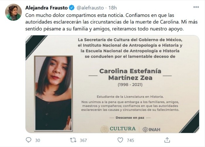 Autoridades de la Ciudad de México asentaron como causa de muerte de la estudiante de la Escuela Nacional de Antropología e Historia (ENAH), Carolina Estefanía, asfixia por ahorcamiento, esto luego del hallazgo del cuerpo de la joven ayer al interior de su casa.Consta en reportes oficiales que el hallazgo fue realizado por elementos de la Policía de Investigación, quienes dieron con la ubicación del cuerpo vía telefónica, y que la estudiante se encontraba en su mismo domicilio.Al arribar al lugar de los hechos, ubicado sobre la calle Vicente Guerrero en la colonia Lomas Era, alcaldía Álvaro Obregón, el abuelo de la joven fue quien permitió el acceso a las autoridades, por lo que constataron que se trataba de la mujer de 22 años.Peritos en criminalística asentaron como causa de la muerte asfixia por ahorcamiento, por lo que se iniciaron las investigaciones para esclarecer el deceso de Carolina, quien fue reportada como desaparecida el pasado 13 de enero.Presuntamente salió de su domicilio hacia una institución bancaria y no se volvió a saber de ella hasta este miércoles, cuando fue hallada dentro de su casa.La secretaria de Cultura, Alejandra Frausto Guerrero, dio a conocer en sus redes sociales el hallazgo del cuerpo de la alumna de la Escuela Nacional de Antropología e Historia (ENAH), estudiante de la Licenciatura en Historia."Con mucho dolor compartimos esta noticia. Confiamos en que las autoridades esclarecerán las circunstancias de la muerte de Carolina. Mi más sentido pésame a su familia y amigos, reiteramos todo nuestro apoyo".Por su parte, la ENAH publicó en sus redes que "la comunidad de la Escuela y quienes se volcaron en su búsqueda se conduelen profundamente y abrazan a amigos y familiares" de la alumna.JM