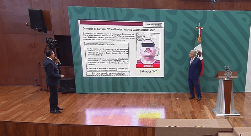 Durante la "mañanera" de hoy, el subsecretario de Seguridad Pública (SSPC), Ricardo Mejía Berdeja, informó sobre la detención de Salvador "N", presunto operador del grupo Guerreros Unidos y a quien se le relaciona con el caso de la desaparición de los 43 estudiantes normalistas de Ayotzinapa."Dando seguimiento al caso Ayotzinapa -que ha sido una indicación presidencial desde el primer día de su mandato- fue detenido Salvador "N", quien es presunto operador del grupo Guerreros Unidos, y que es parte del brazo armado conocido como 'Los Peques' o 'Los Tilos'", reveló el funcionario.Al presentar el informe de Cero Impunidad y frente al Presidente Andrés Manuel López Obrador, el subsecretario indicó que esta persona contaba con una orden de aprehensión por delincuencia organizada y desaparición forzada que se cumplimentó en Jardines de Cuernavaca, de ese mismo municipio.Ricardo Mejía Berdeja informó que ya se solicitó su vinculación a proceso penal, además que Salvador "N" formaba parte de una red de extorsionados y secuestradores.GC