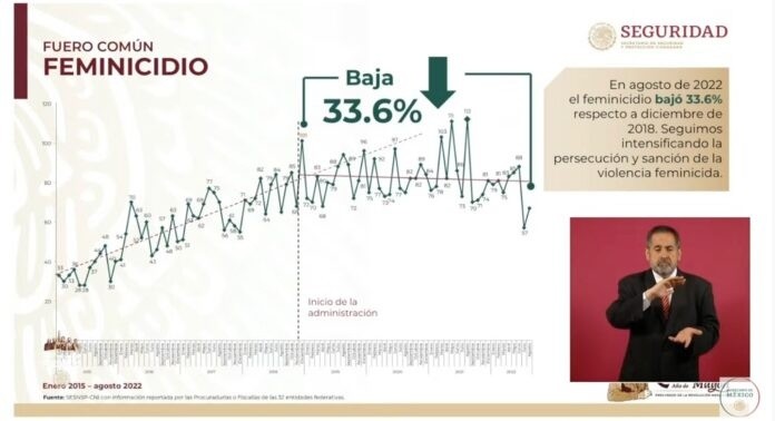 Luego de que en México se registrara una baja histórica de víctimas de feminicidios en el mes de julio, se dio a conocer que en agosto volvieron a repuntar un 17.5 por ciento.De esta manera, el mes pasado se contabilizaron un total de 67 víctimas de dicho delito de alto impacto contra las 57 registradas en julio, esto de acuerdo con el reporte de este martes del Secretariado Ejecutivo del Sistema Nacional de Seguridad Pública (SESNSP).Por su parte, la secretaria de Seguridad y Protección Ciudadana (SSPC), Rosa Icela Rodríguez Velázquez, aseguró que el gobierno federal sigue intensificando la persecución y sanción de la violencia feminicida.No obstante, la funcionaria resaltó que en agosto las víctimas por feminicidio disminuyeron un 33.6 por ciento respecto a diciembre de 2018, el primer mes de la administración del Presidente Andrés Manuel López Obrador.De acuerdo con los reportes oficiales de enero a agosto, suman 615 víctimas de feminicidio, siendo junio el que lidera la lista con 88 casos; le sigue mayo con 85; abril, 83; febrero, 81; enero, 79; marzo, 75; agosto, 67; julio, 67, según las estadísticas del SESNSP.Las entidades que mayor concentración tienen de casos por este delito, de más a menos, son: Estado de México, 95; Nuevo León, 70; Veracruz, 51; Ciudad de México, 46; Oaxaca, 31; Chihuahua, 28; Chiapas, 28; Morelos, 25; Jalisco, 20; Baja California 16; Coahuila, 17; Michoacán, 17. MS