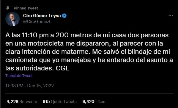El periodista Ciro Gómez Leyva denunció que la noche de este jueves dos motociclistas atentaron contra su vida, no obstante, pudo salir ileso del ataque. Según narra en su cuenta de Twitter, fue a las 11:10 pm cuando, a 200 metros de su casa, dos personas en una motocicleta le dispararon “al parecer con la clara intención de matarme”.Agregó que lo salvó el blindaje de la camioneta que manejaba y ya ha enterado del asunto a las autoridades.