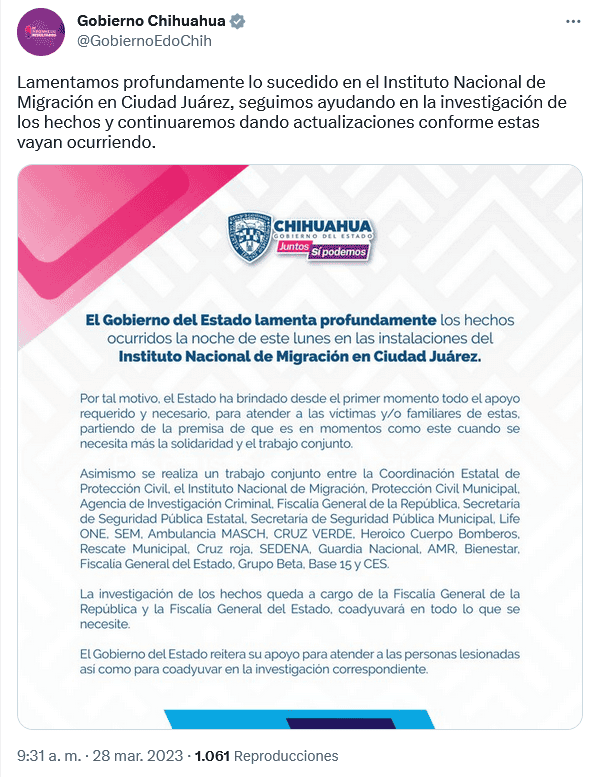 El gobierno del estado de Chihuahua apoya a las autoridades federales en los hechos ocurridos en las instalaciones del Instituto Nacional de Migración (INM) de Ciudad Juárez, en las que 39 personas perdieron la vida y 29 más resultaron heridas.Además, lamentó profundamente los hechos ocurridos ayer lunes, por la noche, y aseguró que el apoyo se brindará a las víctimas o familiares de éstas, porque la premisa en estos momentos se necesita más la solidaridad y el trabajo conjunto.En un comunicado, el gobierno estatal dijo que, de acuerdo con la información que se tiene hasta el momento, el incendio inició en el área de los hombres y dejó como saldo 68 víctimas originarias de Centro y Sudamérica, de las cuales 37 personas adultas fallecieron en el lugar, 31 fueron trasladadas y 2 de ellas perdieron la vida en el Hospital General.De igual forma 15 mujeres fueron evacuadas sin lesiones y serán llevadas a Janos, con lo que suma un total de 83 personas migrantes y 7 empleados evacuados.Los lesionados fueron trasladados para recibir atención médica en los hospitales MSS 6, IMSS 35, Hospital General, Femap, Cruz Roja Mexicana Zona Pronaf y Centro Médico de Especialidades de Ciudad Juárez.Asimismo, explicó que se realiza un trabajo conjunto entre la Coordinación Estatal de Protección Civil, el Instituto Nacional de Migración, Protección Civil Municipal, Agencia de Investigación Criminal, Fiscalía General de la República.Así como la Secretaría de Seguridad Pública Estatal, Secretaría de Seguridad Pública Municipal, Life ONE, SEM, Ambulancia MASCH, CRUZ VERDE, Heroico Cuerpo Bomberos, Rescate Municipal, Cruz roja, SEDENA, Guardia Nacional, AMR, Bienestar, Fiscalía General del Estado, Grupo Beta, Base 15 y CES.La investigación de los hechos queda a cargo de la Fiscalía General de la República y la Fiscalía General del Estado, coadyuvará en todo lo que se necesite.El gobierno de Chihuahua reitera su apoyo para atender a las personas lesionadas así como para coadyuvar en la investigación, se agregó en el comunicado.OF