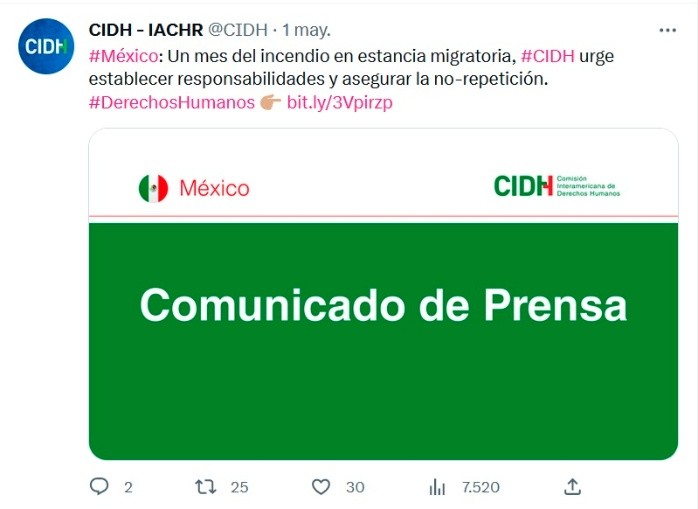La Comisión Interamericana de Derechos Humanos (CIDH) urgió este martes al Estado mexicano a investigar y sancionar a los responsables del incendio que mató a 40 migrantes en una estación del Gobierno en Ciudad Juárez hace un mes, así como reparar adecuadamente los daños a las víctimas."A un mes de los hechos señalados, la CIDH reitera su solidaridad con las víctimas y sus familias, y urge al Estado a actuar con debida diligencia para investigar, sancionar a responsables, reparar adecuadamente a las víctimas y adoptar medidas urgentes para evitar la repetición de estos hechos", dijo el organismo en un comunicado.La Comisión condenó los fallecimientos, pero reconoció las acciones del Estado tras la tragedia, como la suspensión definitiva de las actividades en la estancia provisional; la entrega de tarjetas de visitante por razones humanitarias; el inicio de las investigaciones, y la creación de un consejo para la protección de derechos humanos de los migrantes.Sin embargo, pidió a México aplicar protocolos y medidas que garanticen de manera fiable y efectiva la identificación de las víctimas y la entrega de sus cuerpos a sus familias, con pleno acceso a la información durante los procedimientos.Además, recordó que los migrantes y sus familiares tienen derecho a conocer la verdad de los hechos, lo que implica esclarecer, investigar y procesar a los responsables "y, según las circunstancias, garantizar el acceso a información en poder del Estado".Dijo también que tienen derecho a asistencia, protección, acceso a la justicia y reparación plena y efectiva de los daños sufridos. Lo anterior incluye el acceso a la justicia a través de fronteras en condiciones justas, eficaces y accesibles.La CIDH remarcó que el Estado debe ser garante de derechos frente a las personas bajo custodia. Recordó que, según lo indicado en el principio 68 de los Principios Interamericanos, "el Estado debe garantizar que la detención se utilice únicamente de conformidad con lo autorizado por la ley y solo cuando sea necesaria, razonable en todas las circunstancias y proporcional a un propósito legítimo".JM