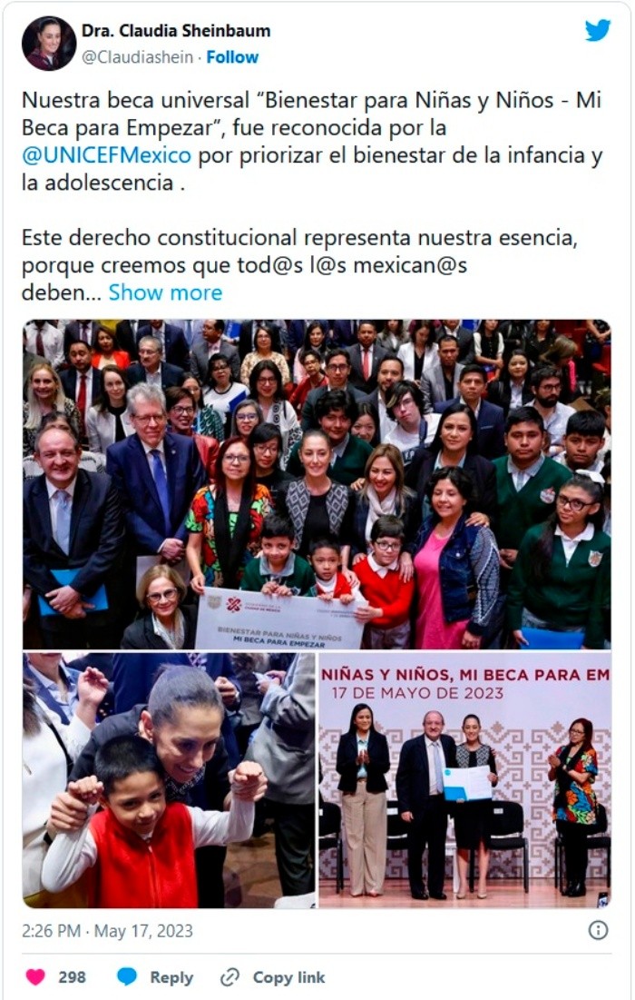 El Fondo de las Naciones Unidas para la Infancia (Unicef) otorgó un reconocimiento a la jefa de Gobierno de la Ciudad de México, Claudia Sheinbaum, por el programa "Mi Beca para Empezar". A decir del organismo, éste se ha convertido en un hito de la política social de la Ciudad de México al priorizar el bienestar de la infancia y la adolescencia en beneficio de 1.2 millones de alumnos de educación básica.Tras agradecer el reconocimiento, la jefa de Gobierno, Claudia Sheinbaum, destacó que los recursos de "Mi Beca para Empezar" se han convertido en la esencia de la economía de la ciudad.En este sentido, subrayó la necesidad de seguir trabajando en la creación de programas sociales que tengan como misión distribuir la igualdad, no sólo en la capital, sino que, en todo el país, una meta que es posible con la colaboración entre el gobierno federal y las administraciones locales, lo que es uno de los cimientos más importantes para asegurar la felicidad del pueblo de México."Todos los mexicanos y mexicanas deben alcanzar el bienestar mínimo para ser felices", aseveróDetalló que casi el 60 por ciento de las familias de la ciudad cuenta con algún apoyo social, ya sea del gobierno federal o local, lo que ha permitido la recuperación y la reactivación económica de la capital, en esta idea de que el desarrollo económico no sólo viene de arriba y de las grandes inversiones, sino que viene de abajo.’’Queremos que los niños y niñas reconozcan a la educación como un eje fundamental de sus vidas’’, destacó Sheinbaum Pardo.Durante la inauguración del Simposio sobre "Protección para la Infancia en Entidades Federativas: la Experiencia de Bienestar para Niñas y Niños Mi Beca para Empezar", el representante de la Unicef, Luis Fernando Carrera, destacó que la protección social es fundamental para promover una sociedad más igualitaria y sin pobreza, y cuando se dirige a esta sector de la población es un mecanismo efectivo para garantizar derechos básicos como son la buena alimentación, la higiene y la educación.“Financiado en su totalidad por el Gobierno de la Ciudad de México, representa un esfuerzo importante y demuestra el compromiso con la infancia y adolescencia de esta ciudad”, expresó al destacar el papel fundamental que jugó este programa durante la pandemia de COVID-19.JM