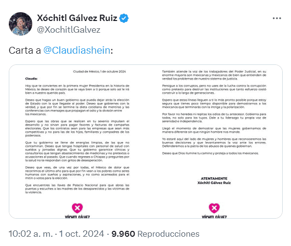Claudia Sheinbaum Pardo toma este martes 1 de octubre el cargo como Presidenta de México, luego de haber ganado las elecciones del pasado 2 de junio. En medio de las celebraciones por parte de quienes están a favor de su gobierno, y las palabras de la oposición, sobresalió en redes sociales la carta que quien fuera su principal rival en el proceso de las votaciones, Xóchitl Gálvez, publicó para desearle "de corazón" que le vaya bien "porque solo así le irá bien a nuestro país".En la misiva, la excandidata de la Coalición PRI-PAN-PRD dice: "Hoy que te conviertes en la primera mujer Presidenta en la historia de México, te deseo de corazón que te vaya bien a ti porque solo así le irá bien a nuestro país".Sin embargo, no todo fueron palabras amables. El texto continúa con reclamos: "Deseo que hagas un buen gobierno que pueda dejar atrás la elección de Estado con la que llegaste al poder. Deseo que gobiernes con la verdad, y que por fin se termine la dieta cotidiana de mentiras y las conferencias con mensajes que propagan el odio y la división entre los mexicanos"."Espero que las obras que se realicen en tu sexenio impulsen el desarrollo y no sirvan para pagar favores y facturas de campañas electorales. Que los contratos sean para empresas que sean más competitivas y no para las de los hijos, familiares y compadres de los poderosos"."Que tu gobierno se llene de energías limpias, de las que no contaminan. Deseo que tengas hospitales con personal de salud con sueldos y jornadas dignas. Que tu gobierno garantice clínicas y consultorios que tengan abastecimiento de medicinas y no pretextos o acusaciones al pasado. Que cuando regreses a Chiapas y preguntes por la salud no te respondan con desesperación"."Que encuentres las llaves de Palacio Nacional para que abras las puertas y escuches a las madres de los desaparecidos y las víctimas de la violencia"."También atiende la voz de los trabajadores del Poder Judicial, en su enorme mayoría son mexicanas y mexicanos de bien que entienden de verdad los problemas de nuestro sistema de justicia".Le pidió que por favor persiga "a los corruptos, pero no uses de la lucha contra la corrupción como pretexto para destruir las instituciones que tanto esfuerzo costó construir a lo largo de generaciones"."Espero que estas líneas lleguen a ti lo más pronto posible porque estoy segura que tienes poco tiempo disponible para demostrarnos a los mexicanos que terminarás con la intriga y la polarización".Sugirió que "por favor, no heredes ni repitas los odios de tu antecesor. Gobierna para todos, no solo para los tuyos. Dale a tu liderazgo tu propia voz de serenidad e independencia"."Llegó el momento de demostrar que las mujeres gobernamos de manera diferente sin que ningún hombre nos mande".Y para finalizar, le dijo: "Yo estaré aquí del lado de mujeres y hombres que reconoceremos las buenas decisiones y que levantaremos la voz ante los errores. Defenderemos la patria de los abusos de quienes gobiernan"."Deseo que Dios ilumine tu camino y proteja a todos los mexicanos".*Mantente al día con las noticias, únete a nuestro canal de WhatsAppOF