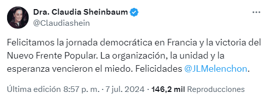 La virtual presidenta electa Claudia Sheinbaum felicitó ayer domingo a Jean-Luc Mélenchon por el triunfo de la coalición de izquierdas Nuevo Frente Popular, en las elecciones legislativas de Francia.Con un mensaje en sus redes sociales, Claudia Sheinbaum destacó que la organización, la unidad y la esperanza vencieron el miedo."Felicitamos la jornada democrática en Francia y la victoria del Nuevo Frente Popular. La organización, la unidad y la esperanza vencieron el miedo. Felicidades @JLMelenchon", dijo Sheinbaum a través de sus redes sociales.La coalición de izquierdas se impuso a la derecha en Francia.Jean-Luc Mélenchon, del Partido Francia Insumisa, ha reclamado al presidente de Francia, Emmanuel Macron, que tiene "el poder y el deber" de dejar gobernar a la izquierda.*Mantente al día con las noticias, únete a nuestro canal de WhatsAppOF