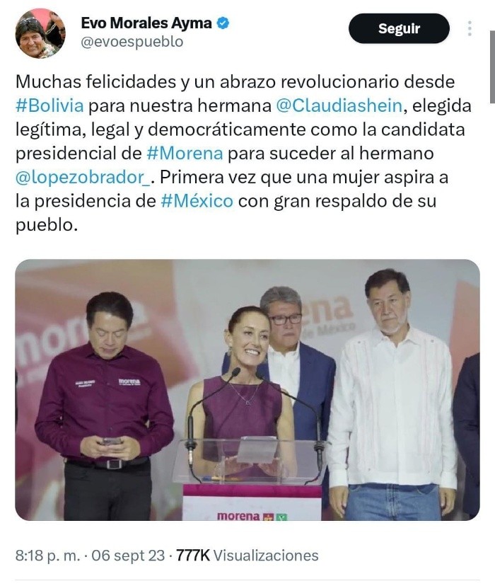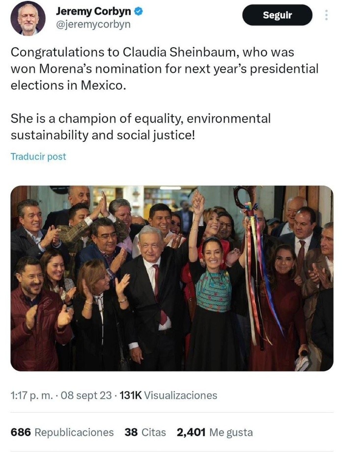 Después de ser nombrada Coordinadora de la Defensa de la Transformación, Claudia Sheinbaum Pardo recibió mensajes de felicitación de destacadas figuras de la comunidad política internacional a través de la plataforma de redes sociales.Entre quienes expresaron sus felicitaciones se encuentran la Vicepresidenta Segunda del Gobierno de España, Yolanda Díaz; el político británico Jeremy Corbyn; y el ex presidente de Bolivia, Evo Morales Ayma.La Ministra de Trabajo y Economía Social del Gobierno español, Yolanda Díaz, escribió: “La ciudadanía mexicana tiene en ti a la mejor candidata para seguir construyendo un México más verde y feminista, un país que cuide la democracia y proteja a la gente. Estaremos a tu lado”.Jeremy Corbyn elogió la carrera política de la Dra. Claudia Sheinbaum Pardo, destacando su compromiso con la igualdad, la sostenibilidad ambiental y la justicia social.“¡Es una defensora de la igualdad, la sostenibilidad ambiental y la justicia social!”Por su parte, Evo Morales enfatizó que la elección de Sheinbaum Pardo fue legítima, legal y democrática.“Primera vez que una mujer aspira a la presidencia de #México con gran respaldo de su pueblo”, escribió. MF