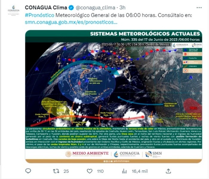 El Servicio Meteorológico Nacional de la Comisión Nacional del Agua (Conagua), prevé la formación del primer ciclón tropical del 2023 en el Pacífico frente a las costas de Guerrero en los próximos siete días.Por el momento hay 30% de probabilidad de baja presión con potencial ciclónico, pero mantiene el 30% de probabilidad en siete días.El Meteorológico informó que la zona de baja presión, que puede convertirse en "Adrián", actualmente se encuentra a 750 kilómetros al sur de Lázaro Cárdenas, Michoacán, y se desplaza hacia el oeste-noroeste a una velocidad de 16 kilómetros.JM