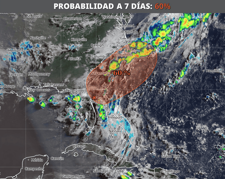 La Comisión Nacional del Agua (Conagua) mantiene en vigilancia de un fenómeno natural en el océano Atlántico, que podría darle forma a “Chantal”, el siguiente de la temporada. Aquí cómo evoluciona:El Servicio Meteorológico Nacional (SMN), fuente climática oficial del Gobierno de México, vigila en el océano Atlántico una zona donde podría generarse una baja presión y, eventualmente, un ciclón tropical. A través de su cuenta en X, informó:Zona de baja presión frente a la costa sureste de Estados Unidos. Incrementa a 20% su probabilidad para desarrollo ciclónico en 48 horas y a 60% en 7 días. Se localiza aproximadamente a 1,120 km al noreste de las costas de Quintana Roo y se desplaza hacia el noreste.Aunque es pronto para prever la formación de un ciclón tropical, de continuar su evolución, llevaría por nombre "Chantal", el tercero de la temporada 2025.En la cuenca del Atlántico se espera que se desarrollen entre 13 y 17 ciclones tropicales durante este 2025; hasta ahora, únicamente se han formado dos tormentas tropicales, "Andrea" y "Barry".Para hoy, la tormenta tropical "Flossie" continuará debilitándose al suroeste de la península de Baja California. Sin embargo, su circulación y bandas nubosas ocasionarán chubascos, rachas de viento de 40 a 60 km/h y oleaje de 2.5 a 3.5 metros de altura en la costa sur de Baja California Sur.Con información del Servicio Meteorológico Nacional* * * Mantente al día con las noticias, únete a nuestro canal de WhatsApp * * *OA