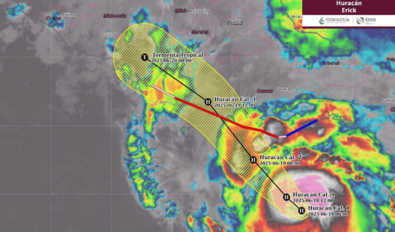 El segundo huracán de la presente temporada de ciclones tropicales ya se formó, es “Erick”, y representa peligro para varias regiones de México.El Servicio Meteorológico Nacional (SMN), de la Comisión Nacional del Agua (Conagua), informó esta mañana del miércoles 18 de junio que “Erick” se intensificó a huracán categoría 1 en la escala Saffir-Simpson. Su amplia circulación ocasionará lluvias puntuales torrenciales, intensas rachas de viento y oleaje elevado en Chiapas, Oaxaca y Guerrero.La distancia al lugar más cercano del ciclón tropical es a 255 km al sur-sureste de Puerto Ángel, Oaxaca, y a 440 km al sureste de Punta Maldonado, Guerrero.Su desplazamiento actual es hacia el noroeste (310°) a 11 km/h y mantiene vientos máximos sostenidos de 120 km/h y rachas de 140 km/h.El pronóstico es de lluvias puntuales torrenciales (150 a 250 mm) en Guerrero, Oaxaca y Chiapas, las cuales podrán estar acompañadas con descargas eléctricas, además de originar el incremento en los niveles de ríos y arroyos, deslaves, encharcamientos e inundaciones en zonas bajas de los estados indicados.Se prevé que mañana, “Erick” alcance la categoría como huracán categoría 2, cuando se localice a 100 km al sur-suroeste de Puerto Escondido, Oaxaca. Y ese mismo día baje a categoría a 1, pero en tierra, a 50 km al nor-noroeste de Punta Maldonado, Guerrero.Se prevé viento de 100 a 120 km/h con rachas de 130 a 150 km/h en costas de Oaxaca y Guerrero; de 40 a 60 km/h con rachas de 70 a 90 km/h en la costa de Chiapas; además de oleaje de 5.0 a 6.0 metros de altura en las costas de Oaxaca y Guerrero., y de 4.0 a 5.0 metros de altura en la costa de Chiapas. Debido a que las condiciones son favorables para una rápida intensificación, no se descarta que, durante el jueves, Erick alcance la categoría de huracán mayor antes de ingresar a territorio nacional.Autoridades piden extremar precauciones a la población en general en las zonas de los estados mencionados por lluvias, viento y oleaje (incluyendo la navegación marítima) y atender las recomendaciones emitidas por las autoridades del Sistema Nacional de Protección Civil, en cada entidad.Con información de Conagua* * * Mantente al día con las noticias, únete a nuestro canal de WhatsApp * * *OA