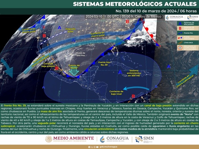 Este domingo, el frente frío número 39, se extenderá sobre el sureste mexicano y la Península de Yucatán, y en interacción con un canal de baja presión extendido en dichas regiones, ocasionará lluvias puntuales intensas en Chiapas, muy fuertes en Veracruz y Tabasco, fuertes en Oaxaca, Campeche, Yucatán y Quintana Roo, así como chubascos en Puebla. La masa de aire frío asociada al frente, generará descenso de temperaturas diurnas sobre el norte, noreste, oriente y sureste del territorio nacional, así como el refrescamiento de las temperaturas en el centro del país, incluido el Valle de México. Por otra parte, una vaguada polar recorrerá el noroeste del país, y en interacción con el ingreso de humedad generado por la corriente en chorro subtropical, ocasionarán chubascos en Chihuahua y Durango, lluvias aisladas en Coahuila, así como posible caída de aguanieve o lluvia engelante en las sierras del sur de Chihuahua y norte de Durango. Finalmente, una circulación anticiclónica en niveles medios de la atmósfera mantendrá baja probabilidad de lluvia en el occidente, centro y sur del país, así como ambiente cálido a caluroso sobre dichas regiones. *Mantente al día con las noticias, únete a nuestro canal de WhatsApp aquí: https://whatsapp.com/channel/0029VaAf9Pu9hXF1EJ561i03MV