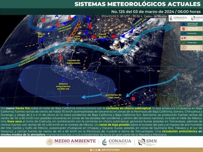 El Servicio meteorológico Nacional pronostica para este domingo lluvias fuertes en algunos estados del país, mientras que en otros, se espera que el calor alcance temperaturas de hasta los 45 grados. Por otro lado, el pronóstico diario del Instituto de Astronomía y Meteorología de la Universidad de Guadalajara, pronostica que el sistema anticiclónico que se encontraba en el centro y sur de la República Mexicana se ha desplazado más al sur y debilidad, por lo cual, aunque la temperaturas seguirán algo altas en buena parte de los estados del centro, sur y sureste de México, serán notablemente más bajas que los días anteriores.El SMN señala, que los fenómenos meteorológicos más significativos que se esperan para este domingo son la proximidad de un nuevo frente frío y la corriente en chorro subtropical, que causará lluvias fuertes en Baja California y viento con tolvaneras en la península de ese mismo estado, Sonora, Chihuahua y Durango. Mientras que el frente frío 38 se seguirá extendiéndose, con características de estacionario, sobre el Golfo de México y dejará de afectar al territorio.También se espera una circulación anticiclónica en niveles medios de la atmósfera que continuará generando ambiente cálido a caluroso y baja probabilidad de lluvia sobre gran parte de la República Mexicana. *Mantente al día con las noticias, únete a nuestro canal de WhatsApp aquí: https://whatsapp.com/channel/0029VaAf9Pu9hXF1EJ561i03MV