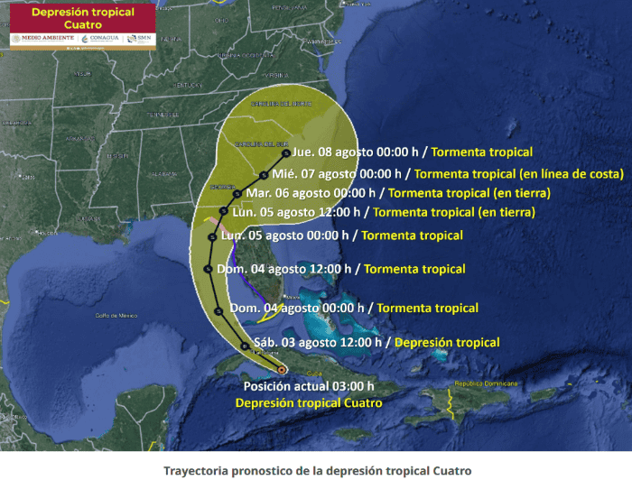 El Servicio Meteorológico Nacional (SMN), fuente climática oficial del Gobierno de México, informó este sábado que la depresión tropical Cuatro se encuentra al sur de Cuba, por lo que mantiene vigilancia sobre el fenómeno.El SMN aseguró que el centro de la depresión tropical Cuatro se localiza al sur de Cuba. Por su lejanía no afecta al territorio mexicano. Por ahora, el fenómeno natural se localiza a 135 km al sur-sureste de Varadero, Cuba y a 640 km al este de Cancún, Quintana Roo.Su desplazamiento actual es hacia el oeste-noroeste (285°) a 26 km/h y mantiene vientos máximos sostenidos de 45 km/h y rachas de 65 km/h.Según el pronóstico, mañana domingo se convertiría en tormenta tropical, cuando se encuentre a 525 km al noreste de Cabo Catoche, Quintana Roo.* * * Mantente al día con las noticias, únete a nuestro canal de WhatsApp * * *OA