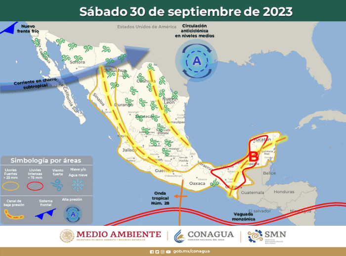 El Servicio Meteorológico Nacional (SMN), fuente climática oficial del Gobierno de México en materia climática, anunció desde ayer el ingreso de un nuevo frente frío al territorio nacional este sábado.A través de su pronóstico de ayer, el SMN señalaba que desde hoy y hasta el domingo, se anticipa un temporal de lluvias muy fuertes a intensas sobre la península de Yucatán y sureste mexicano, debido a un sistema de baja presión en interacción con la onda tropical número 28, un canal de baja presión e inestabilidad en niveles altos de la atmósfera.Durante la tarde-noche, un nuevo frente frío, asociado con la corriente en chorro polar, arribará al noroeste del país, originando lluvias aisladas en Baja California, así como vientos de 60 a 80 km/h y posibles tolvaneras en Baja California, Sonora y Chihuahua. Lluvias el sábado 30 de septiembre:Lluvias domingo 01 de octubre:Lluvias lunes 02 de octubre:Con información del Servicio Meteorológico NacionalOA