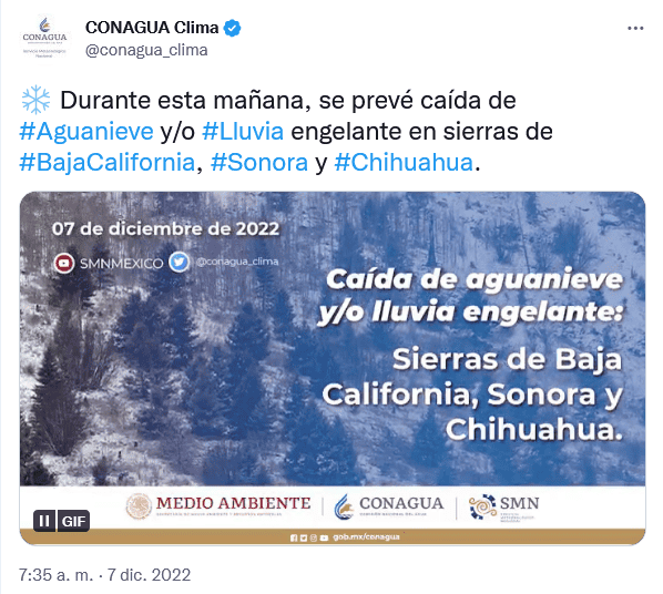 Para este miércoles la entrada de humedad originada por la corriente de chorro subtropical, en interacción con un vórtice de núcleo frío sobre el suroeste de los Estados Unidos, ocasionarán lluvias puntuales fuertes en Sonora y Chihuahua, con probabilidad para la caída de lluvia engelante o aguanieve durante esta mañana, en sierras de ambos estados y de Baja California.El Servicio Meteorológico Nacional (SMN) de la Comisión Nacional del Agua (Conagua) informó que un canal de baja presión sobre el sureste de México y la entrada de humedad del Golfo de México y Mar Caribe, originarán lluvias con intervalos de chubascos en Oaxaca, sur de Veracruz, Chiapas y Quintana Roo, así como lluvias aisladas en el noreste, oriente y sureste del territorio nacional.Además, el ingreso de humedad del Océano Pacífico producirá chubascos con descargas eléctricas en zonas de Baja California Sur, Jalisco, Colima, Michoacán y Guerrero.Finalmente, una circulación anticiclónica en niveles medios de la atmósfera, generará ambiente fresco durante la mañana y noche sobre entidades de la Mesa del Norte y la Mesa Central, así como ambiente frío con posibles heladas al amanecer en zonas serranas.***OF