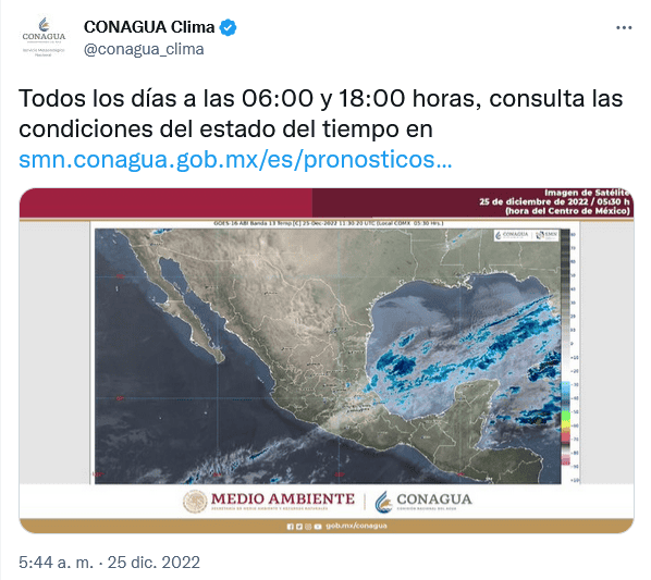 Para esta Navidad, el Frente Frío 19 se extenderá como estacionario sobre el occidente del Mar Caribe, mientras que interaccionará con la entrada de humedad, lo que ocasionará probabilidad para lluvias intensas en Veracruz, Tabasco, Chiapas, Campeche, Yucatán y Quintana Roo; y lluvias muy fuertes en Oaxaca.Cabe mencionar que dichas lluvias podrían incrementar los niveles de ríos y arroyos, y producir deslaves e inundaciones.Por su parte, el Servicio Meteorológico Nacional (SMN), dependencia de la Comisión Nacional del Agua (Conagua), continuará la onda gélida sobre entidades del noroeste, norte, noreste, centro, oriente y sureste de la República Mexicana, y el evento de "Norte" intenso en costas de Veracruz, Istmo y Golfo de Tehuantepec, y muy fuerte en costas de Tamaulipas, Tabasco, Campeche, Yucatán y Quintana Roo.OF