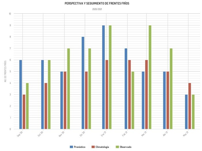 El primer frente frío de la temporada 2021-2022 en México ingresará mañana martes sobre el norte y noreste de México, previó el Servicio Metereológico Nacional (SMN).En su boletín de las 18:00 horas, el SMN agregó que este frente frío número 1 interaccionará con un canal de baja presión en el noreste y oriente del territorio nacional, lo que provocará lluvias de fuertes a puntuales muy fuertes acompañadas de descargas eléctricas y posible caída de granizo en las regiones mencionadas.Además se esperan fuertes rachas de viento con probabilidad de formación de torbellinos en los estados de Coahuila, Nuevo León y Tamaulipas. Las temperaturas mínimas para el martes 21 serán de 0 a 5 grados en zonas montañosas de Chihuahua, Durango, Michoacán, Estado de México, Tlaxcala y Puebla.Por otro parte, el SMN dijo que la onda tropical número 32 al sur de Jalisco y Colima interactuará mañana con un canal de baja presión en el occidente y centro del país, por lo que se pronostican lluvias e intervalos de chubascos en esas regiones. Agregó que las lluvias pueden estar acompañadas de descargas eléctricas, rachas de viento y caída de granizo.El Servicio Metereológico Nacional indica que la temporada de un frente frío inicia en septiembre y continúa hasta el mes de mayo del siguiente año. Según las estadísticas del organismo dependiente de la Comisión Nacional del Agua, en la temporada 2020-2021 se observaron 57 frentes fríos en México. En septiembre de 2020 se registraron 4, mientras que los meses con más frentes fríos fueron enero y marzo de 2021, con 9 cada uno.Si te interesó esta noticia y quieres saber más, entonces descarga y descubre INFORMAPlus, la aplicación digital de EL INFORMADOR, en donde tenemos contenidos exclusivos, seleccionados por nuestros editores, para darles una experiencia más completa a los lectores. Descarga la aplicación y pruébala GRATIS por treinta días. Para iOS: https://apple.co/35jaVgbPara Android: https://bit.ly/3gwVSEVSi eres suscriptor de EL INFORMADOR tu acceso está incluido, solicítalo al 33 3678-7777IM