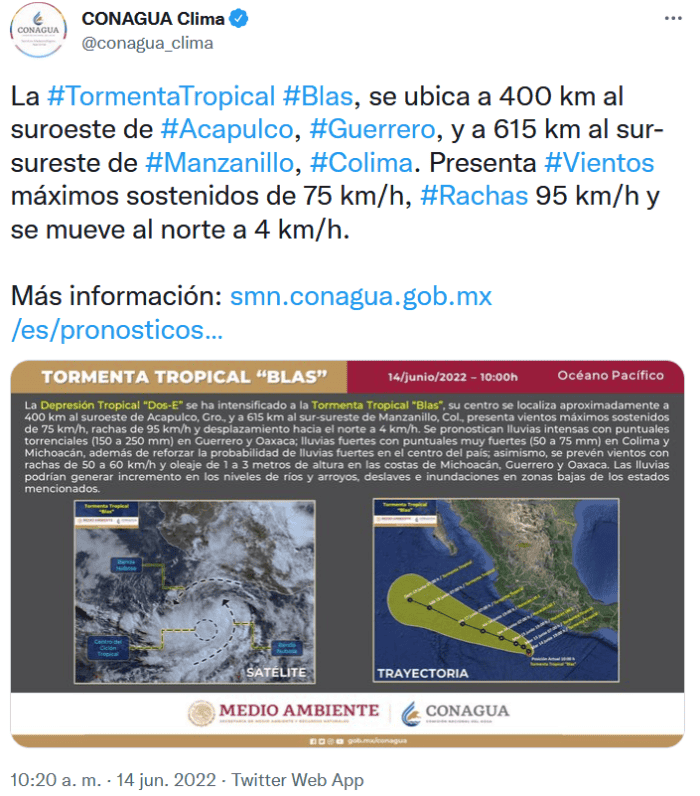La Comisión Nacional del Agua (Conagua) informó la mañana de hoy martes, que la depresión tropical "Dos-E" se ha intensificado a tormenta tropical "Blas". El centro de "Blas" se localiza frente a las costas de Guerrero, y ocasionará lluvias, vientos fuertes y oleaje elevado en estados del occidente y sur del país, como Jalisco.De acuerdo con el Servicio Meteorológico Nacional, también se prevén lluvias intensas con puntuales torrenciales en Guerrero y Oaxaca; lluvias fuertes con puntuales muy fuertes en Colima y Michoacán, además de reforzar la probabilidad de lluvias fuertes en el centro del país.Se espera viento con rachas de 50 a 60 km/h y oleaje de uno a tres metros de altura en costas de Michoacán, Guerrero y Oaxaca.Por lo anterior, las autoridades recomiendan extremar precauciones en las zonas de los estados mencionados por lluvias, viento y oleaje (incluyendo la navegación marítima) y atender las recomendaciones emitidas por las autoridades del Sistema Nacional de Protección Civil, en cada entidad.Antes, la gobernadora de Guerrero, Evelyn Salgado Pineda, informó que la unidad de Protección Civil mantenía la vigilancia ante los efectos de la depresión tropical."Los 651 refugios temporales están listos para ser habilitados en caso de ser necesario, ubica el más cercano".Por último, señaló que se prevé que los efectos de un nuevo evento de Mar de Fondo afecte las costas del estado, por lo que están cerrados a la navegación los puertos de Acapulco y Zihuatanejo.GC