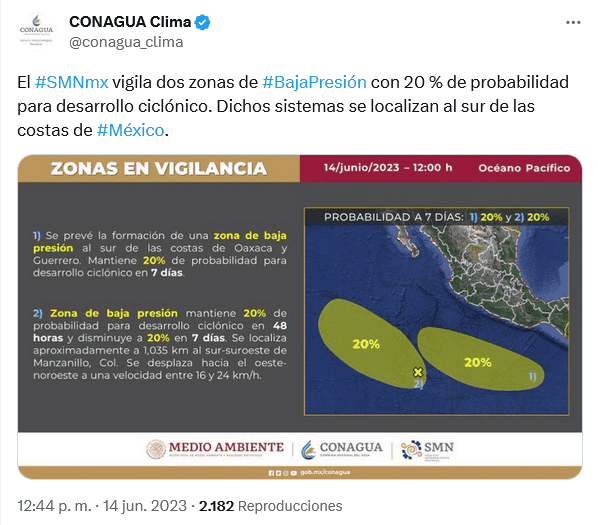 ¿Ya vienen las lluvias? En su reporte de las 12:00 del mediodía, el Servicio Meteorológico Nacional (SMN) informó que vigila dos zonas de baja presión con 20% de probabilidad para desarrollo ciclónico, los cuales se localizan al sur de las costas del Pacífico Mexicano.En su mensaje, la dependencia de la Conagua indica que se prevé la formación de una zona de baja presión al sur de las costas de Oaxaca y Guerrero, con 20% de probabilidad de desarrollo ciclónico en 7 días.La otra mantiene un 30% de de probabilidad para desarrollo ciclónico en 48 horas y disminuye a 20% en 7 días. Se localiza a mil 035 kilómetros al sur-suroeste de Manzanillo, Colima. Se desplaza hacia el oeste-noroeste a una velocidad entre 16 y 24 kilómetros. En su imagen interpretada, el SMN indica que una circulación anticiclónica en niveles medios de la atmósfera mantendrá la tercera onda de calor con temperaturas superiores a los 30 grados Celsius en los 32 estados del país. El canal de baja presión, en combinación con divergencia en altura e ingreso de humedad del Pacífico, Golfo de México y Mar Caribe, dejan lluvias en zonas de Oaxaca y Chiapas. Sin embargo, aunque las zonas de inestabilidad antes mencionadas están frente a las costas de México con potencial de desarrollo ciclónico, no afectan, de momento, costas nacionales.De acuerdo con el portal meteored.com, en las últimas horas, la inestabilidad ha aumentado en las aguas del Pacífico, muy al sur del territorio nacional. El Centro Nacional de Huracanes de Estados Unidos está comenzando a vigilar las zonas de baja presión con un 20% de probabilidad para ser ciclones tropicales a finales de esta semana moviéndose al oeste-noroeste con una distancia mayor a 500 km de las costas, por lo que sus efectos serán mínimos. Sin embargo, este fin de semana, con la llegada de una onda tropical activa, habrá cambios.Prevén que el jueves, la posible onda tropical número 3 ocasione lluvias/tormentas fuertes en Chiapas, Oaxaca y Guerrero, extendiéndose hacia el fin de semana; esta onda es la que podría evolucionar también a ciclón tropical, manteniéndose lejos de México, pero justo su circulación es la que nos incrementará lluvias en el sur y sureste del país. Hasta el momento se mantiene las tendencias de que finalicemos con incremento de lluvias, principalmente en la mitad centro-sur conforme más ondas y ciclones se activen.OF