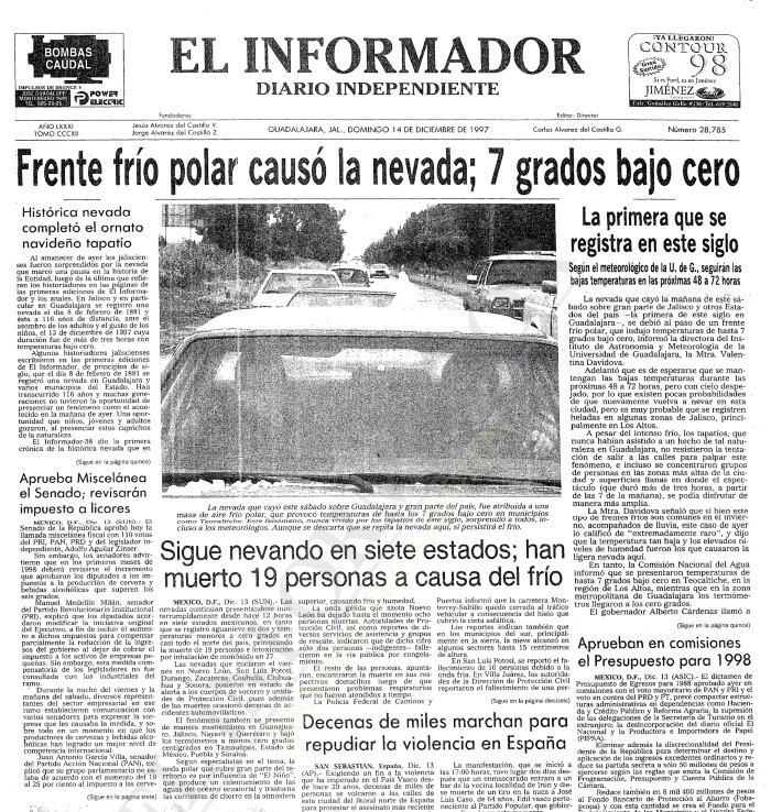El pasado jueves, científicos confirmaron el inicio del fenómeno "El Niño", debido al calentamiento del mar y los vientos en la troposfera. Estudios demostraron anomalías en las costas de ecuador y Perú, situación necesaria para la aparición de este evento. Como es de pensarse, este cambio favorece también el acontecer de fenómenos climáticos extremos en México, entre estos, que las lluvias de invierno se intensifiquen y las de verano se debiliten, mientras que en la zona centro norte aumentan los frentes fríos al final del año, y disminuyen los huracanes en el Atlántico y el Golfo.De acuerdo con el sitio Meteored.com, desde 1950 hasta la fecha se han presentado más de 20 eventos ligeros a fuertes que han ocasionado efectos desde benéficos a perjudiciales, de acuerdo con la región y el momento del año. Un ejemplo es lo ocurrido en el periodo de 1997-1998, cuando el fenómeno "El Niño" dejó intensas lluvias en la zona del Pacífico Mexicano, destacando los efectos devastadores del huracán "Paulina", que con una categoría 4 afectó los estados de Oaxaca y Guerrero y dejó cientos de muertos y damnificados, antes de que otro ciclón, "Linda", de categoría 5, se convirtiera en el más poderoso en la zona nororiental hasta ese año.Más tarde ese año, se registró un invierno de frío extremo, acompañado de lluvias, y que entre otros momentos climáticos destacados están la nevada en diciembre del 13 de diciembre, que se registró en Guadalajara, Jalisco.La primavera de 1998 fue sofocante, y en la Ciudad de México se registró una temperatura récord que se mantiene hasta el día de hoy, con 33.9 grados Celsius.Otro periodo extremo fue el 2015-2016, cuando se formó en el Pacífico, frente a las costas de Jalisco, el huracán más intenso hasta el momento, "Patricia", con vientos de hasta 345 km/h.En marzo de 2016, una tormenta invernal extrema recorrió nuestro país generando viento fuerte de hasta 100 km/h, granizadas incluso en costas, lluvias-tormentas, nevadas en varios estados y claro, un ambiente muy frío. La más recordada quizá sea la del 9 de marzo, cuando cayó agua nieve en la zona de Zapopan, Jalisco. OF