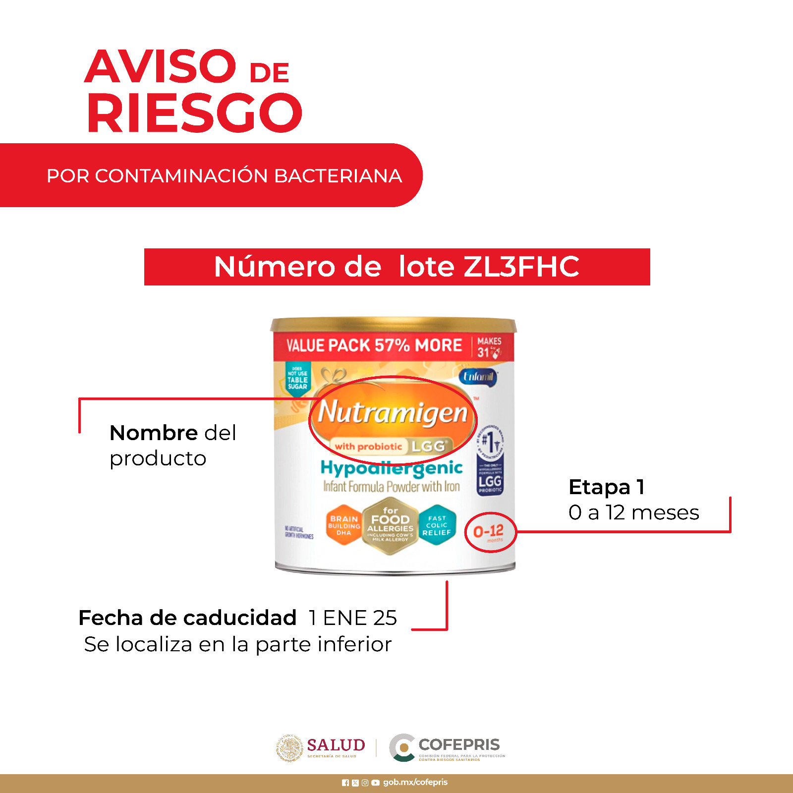 A través de un comunicado, la Comisión Federal para la Protección contra Riesgos Sanitarios (Cofepris), informó el retiro del mercado mexicano de la fórmula infantil Nutramigen, prescrita para lactantes con alergia a la leche de vaca, debido a que se ha detectado contaminación con la bacteria Cronobacter sakazakii.Esta bacteria, presente de forma natural en el medio ambiente, puede ocasionar con poca frecuencia enfermedades graves como septicemia o meningitis, ambas mortales en infantes. Entre los síntomas que podrían indicar la posible contaminación se encuentran el llanto excesivo, dificultad para alimentarse e, incluso, convulsiones.El fabricante Mead Johnson Nutricionales de México notificó a la Cofepris el retiro voluntario del lote ZL3FHC Nutramigen Premium LGG PWD 357 g, etapa 1 de 0 a 12 meses, con fecha de caducidad 1 ENE 25, el cual se distribuyó en México.Ante estos hechos, Cofepris desplegó acciones preventivas y de vigilancia para garantizar la seguridad de personas recién nacidas y bebés, y recomienda que, previo a la adquisición de la fórmula infantil Nutramigen Premium LGG PWD, se realice una inspección de la parte inferior de la lata para identificar el número de lote y la fecha de caducidad.Adicionalmente, se exhorta a la población a estar alerta ante cualquier síntoma que presente el lactante y, en su caso, acudir a un profesional de la salud, quien a través de valoración y estudios proporcionará un diagnóstico especializado y el tratamiento a seguir.En caso de haber adquirido alguno de los lotes indicados de Nutramigen, se insta a los consumidores a contactar a Mead Johnson Nutricionales de México al teléfono 800-1239558 o por correo electrónico en: atencionalconsumidor@reckitt.com para la devolución del producto.En caso de identificar los números de lote descritos y la fecha de caducidad del 01/01/2025 (1 JAN 25 o 1 ENE 25), no adquirir el producto y de contar con información realizar la denuncia sanitaria correspondiente.También, estar alerta a cualquier síntoma que presente el lactante y, en su caso, acudir con un profesional de la salud, quien a través de valoración, estudios y análisis proporcionará un diagnóstico especializado y el tipo de tratamiento a seguir.*Mantente al día con las noticias, únete a nuestro canal de WhatsApp aquí: https://whatsapp.com/channel/0029VaAf9Pu9hXF1EJ561i03MV