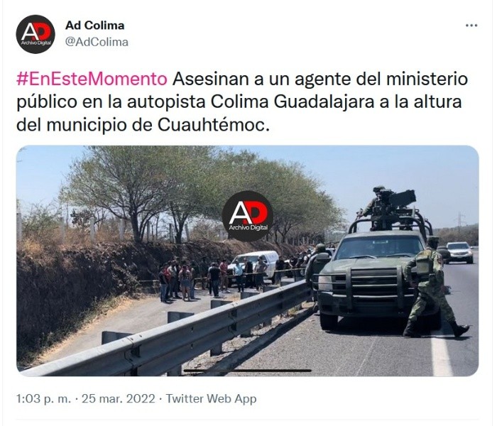Este viernes fue ejecutado un agente del Ministerio Público en el municipio de Cuauhtémoc, en Colima. La víctima, identificada como Manuel, fue acribillada en una brecha contigua a la carretera Colima-Guadalajara. Debido a este hecho, se registró un intenso congestionamiento vial en la carretera, con enormes filas de vehículos que no han podido avanzar.Este sería el segundo homicidio de un agente colimente registrado en menos de una semana. De acuerdo con los primeros reprotes locales, el cuerpo de la víctima se encontraba al interior de una camioneta tipo Hilux. En la escena del crimen fueron asegurados más de 100 casquillos pertenecientes a armas largas y cortas.Hasta el momento, las autoridades no han brindado mayores detalles sobre la ejecución.Luego de que se diera a conocer el hecho, la Fiscalía General de Colima informa que ya comenzaron las investigaciones para esclarecer el homicidio del agente ministerial, ocurrido alrededor de las 11:30 horas.A través de un comunicado, la Fiscalía condenó el hecho y externó sus condolencias a familiares y seres queridos de la víctima; de igual manera, garantizaron que se realizarán todas las indagatorias pertinentes para detener y castigar a los responsables de este crimen.JM