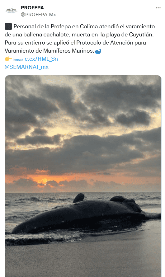 Una ballena tipo cachalote, que se encontraba en estado de gestación, quedó varada en las costas del municipio de Cuyutlán, en Colima, luego de chocar contra una embarcación, lo que provocó su muerte; la autoridad señala que el incidente le causó al animal una herida de tamaño considerable en el costado derecho posterior.La Universidad de Colima informó en un comunicado que el ejemplar de hembra adulta fue atendido por un equipo de especialistas y estudiantes de la Facultad de Ciencias Marinas de dicha casa de estudios, liderado por el profesor e investigador Christian Ortega Ortiz, quien informó que este caso es el primer registro de varamiento de un cachalote en la costa colimense, hecho por el que es importante conservar a los mamíferos marinos en la región.Al respecto, la Procuraduría Federal de Protección al Ambiente (Profepa) comunicó que personal de la Oficina de Representación en Colima atendió el incidente y, para su entierro, aplicó el Protocolo de Atención para Varamiento de Mamíferos Marinos.Explicó que el protocolo tiene la finalidad de establecer bases y procedimientos para la atención de encallamientos de mamíferos marinos en territorio nacional. En este protocolo deben involucrarse autoridades de los gobiernos federal, estatal y municipal, así como grupos voluntarios de apoyo.*Mantente al día con las noticias, únete a nuestro canal de WhatsAppOF