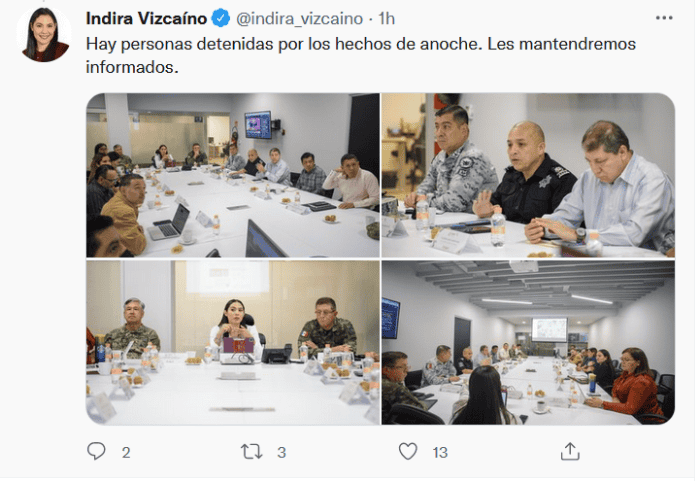 La gobernadora de Colima, Indira Vizcaíno Silva, informó que ya hay detenidos por los incendios que se registraron desde la madrugada de hoy viernes en algunos puntos de la capital del estado. Confirmó que las corporaciones de seguridad de los tres niveles de gobierno se mantendrían alertas ante las posibles reacciones del grupo delictivoPor lo menos siete vehículos fueron incendiados y una tienda de conveniencia atacada a tiros durante la noche de ayer jueves y la madrugada de este viernes en la zona conurbada de Colima y Villa de Álvarez tras la detención, en la Ciudad de México, de José Bernabé Brizuela, alias "La Vaca", líder del grupo delictivo "Los Mezcales", que desde principios de este año mantiene una disputa con el Cártel Nueva Generación en la capital del estado."Nos encontramos reunidas y reunidos en el C5i, como parte de la sesión permanente de la Mesa de Coordinación Estatal para la Construcción de Paz y Seguridad. Todas las corporaciones nos encontramos en alerta y coordinadas para proteger a las y los colimenses. Hay personas detenidas por los hechos de anoche. Les mantendremos informados", publicó la gobernadora esta mañana de viernes en sus redes sociales.De forma preliminar se informó que sobre la Calzada Galván, en el Centro de Colima, fueron incendiados tres vehículos; uno más fue localizado sobre la calle Belisario Domínguez y uno más se reportó en la Colonia Magisterial.Además, en Villa de Álvarez se reportó el incendio de otro auto sobre la calle García Conde, y de una camioneta en la colonia Morelos.En la avenida Maclovio Herrera y la calle Corregidora, en Colima capital, un grupo de sujetos armados disparó contra una tienda de conveniencia Kiosko; hasta el momento no se reportan personas heridas y se espera que más tarde las autoridades brinden más detalles de lo ocurrido.En marzo pasado, fuerzas federales capturaron en Zapopan, Jalisco, a Aldrin Miguel Jarquín Jarquín, lugarteniente del Cártel de Jalisco Nueva Generación en Colima y quien, según información del gobierno federal, encabezaba la guerra contra "La Vaca" y "Los Mezcales", sin embargo, en abril pasado obtuvo un amparo contra su detención y las autoridades no han informado si obtuvo su libertad o se logró combatir ese recurso legal.GC