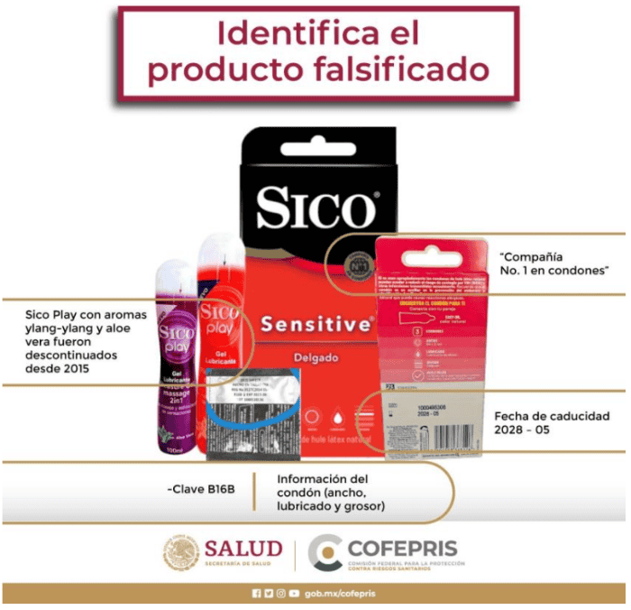 Primero fueron los refrescos de cola, ahora son los condones; la piratería no tiene límites. La Comisión Federal para la Protección contra Riesgos Sanitarios (Cofepris) emitió una alerta sobre la falsificación de condones Sico Sensitive y Sico Safety, así como lubricantes Sico Play con aromas, aloe vera e ylang-ylang.La Cofepris, en conjunto con la empresa RB Health México, que distribuye estos productos, identificaron irregularidades en el empaque secundario de los condones Sico Sensitive con lote 1000495308, en presentación cartera con tres preservativos; dichos empaques fueron llenados con condones Sico Safety, lote 1000538136.Además, muestran irregulares en ambos empaques, como se muestran a continuación:Asimismo, se informa que los geles lubricantes Sico Play con aromas, aloe vera e ylang-lang están descontinuados desde 2015; sin embargo, se ha identificado su comercialización en plataformas digitales. El producto Sico Play gel lubricante aloe vera ostenta número de lote EV520, mientras que Sico Play ylang-ylang no cuenta con información alguna.La Cofepris recomienda a la población en general que, previo a la adquisición de condones marca Sico Sensitive, verifique el número de lote y empaque para evitar la compra del producto falsificado. Además, se sugiere no adquirir los lubricantes descritos anteriormente.También, hace un llamado a distribuidores y farmacias para que, en caso de tener existencia de productos con las características mencionadas, sean inmovilizados, además de contactar a esta autoridad sanitaria y realizar la denuncia correspondiente.La Cofepris asegura que continuará protegiendo la salud de todas y todos a través de diferentes acciones como la constante vigilancia sanitaria para identificar productos, empresas o establecimientos que incumplan la legislación sanitaria vigente y representen un riesgo a la salud de la población.OA