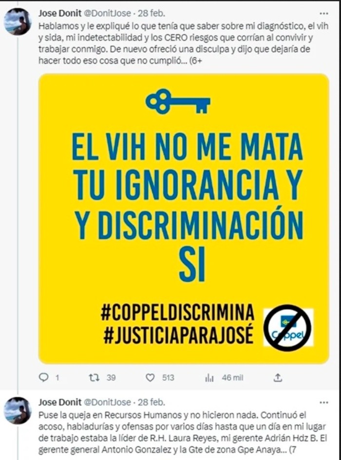 Un supuesto extrabajador de una conocida tienda departamental contó en redes sociales que, cuendo en su empleo se enteraron que padecía VIH, difundieron su diagnóstico sin permiso, fue discriminado y acosado hasta ser despedido "sin argumentos".Por medio de un hilo de Twitter, el usuario @DonitJose narró cómo se fueron suscitando los hechos."Fui trabajador de #Coppel (Suc. Puerta Aragón) durante 1 año y 3 meses, nunca tuve ningún problema con nadie, hacía mi trabajo con normalidad, cumplía mis metas exigidas, etc. Hasta que en una revisión de imprevisto a las pertenencias de mis compañeros y mías vieron que yo llevaba mi medicamento retroviral en la mochila, mi jefe directo (Adrián Hdz Barrientos) al verlo me preguntó para qué era, le mentí diciéndole cualquier cosa pero él decidió investigar por su cuenta", dijo el joven.Aunado a ello, detalló que, en una junta, el jefe directo le exigió que contara sobre lo que padecía. "Yo me negué de inmediato y lo frené respetuosamente diciendo que no tenía ninguna responsabilidad de contarle a nadie algo personal que no interfería en mi actividad laboral, el aceptó y afirmó no divulgaría nada".Sin embargo, el joven comentó que empezó a contarse por toda la empresa e incluso llegó a recibir comentarios ofensivos como "sidoso".Por ello, decidió hablar con su jefe y le explicó sobre "el vih y sida, mi indetectabilidad y los CERO riesgos que corrían al convivir y trabajar conmigo", por lo que el jefe dijo que cerraría el tema "cosa que no cumplió".En tanto, el usuario detalló que pese a poner la queja en recursos humanos el acoso y las ofensas continuaron, hasta que sus jefes le explicaron el motivo por el cual ya no podía laborar en dicha empresa. "Juntos me dijeron que ya no podía trabajar ahí porque era 'un riesgo' para todos los demás y que tenía que firmar mi renuncia, me negué, dije que era discriminación y me dijeron que no podía salir del edificio hasta firmar, iba a llamar a la policía y fue como me liberaron".Luego de que fuera despedido, el joven decidió presentar una denuncia con apoyo de la COPRED y VIHve Libre; sin embargo, sus jefes le dijeron que "ni me molestara en denunciar porque ellos tenían abogados muy grandes y no procedería nada".Finalmente, el usuario confesó que luego de pasar por esa situación "me desencadenó problemas de depresión y ansiedad, que incluso atenté contra mi propia vida, además de muchas otras situaciones emocionales y físicas ocasionadas por estrés al estar viviendo esta situación, es por eso que lo hago público, porque NADIE debería vivirlo"."NADIE debería pasar por algo así, mi diagnóstico no es motivo de incapacidad, mi diagnóstico es mío, mi diagnóstico NO DAÑA ni pone en peligro a nadie, tu ignorancia, discriminación y agresiones contra lxs que vivimos con VIH, SÍ", sentenció.Para poder presentar una denuncia por discriminación, es necesario dejar una petición en el Consejo Nacional para Prevenir la Discriminación (Conapred).Así, deberás ingresar al portal: www.conapred.org.mx, donde pedirá que anotes los campos requeridos y obligatorios como:JM