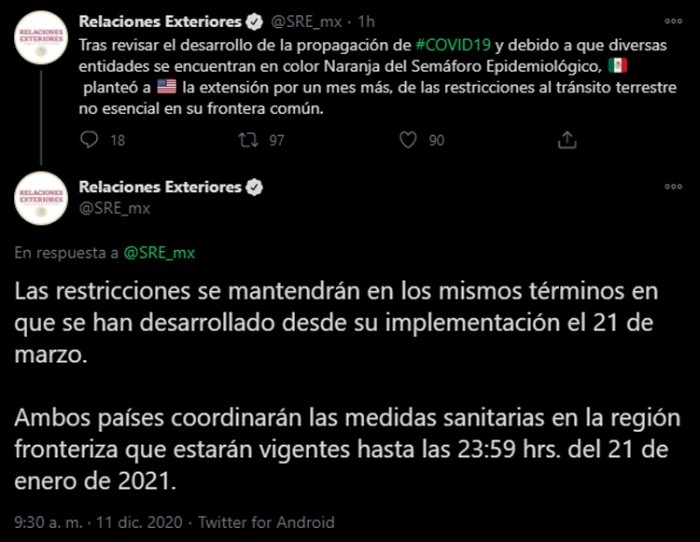 La frontera terrestre entre México y Estados Unidos permanecerá con restricciones hasta el 21 de enero de 2021, informó este viernes la Secretaría de Relaciones Exteriores.A través de su cuenta de Twitter, la dependencia señaló que la medida se tomó tras revisar el desarrollo de la propagación del COVID-19 y debido a que diversas entidades se encuentran en color Naranja del Semáforo Epidemiológico.Añadió que las restricciones se mantendrán en los mismos términos en que se han desarrollado desde su implementación el 21 de marzo.México sumó, al corte de este 10 de diciembre, 112 mil 326 muertes por COVID-19, con un millón 217 mil casos de contagios confirmados de coronavirus, según informaron autoridades de la Secretaría de Salud.OF