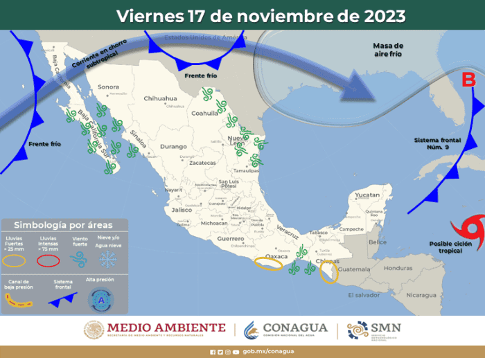 El frente frío 9 se encuentra instalado en el país desde días pasados y aún generarán condiciones climáticas en varias regiones del territorio nacional durante los próximos días, pero el Servicio Meteorológico Nacional (SMN), fuente climática oficial del Gobierno de México, informó ya sobre la aparición de dos fenómenos más que están por ingresar a México y aquí te contamos cuándo y cómo afectarán.El jueves, el frente Núm. 9 se extenderá sobre el Mar Caribe, sin afectar México. La masa de aire frío asociada continuará modificando sus características, favoreciendo un ascenso gradual de las temperaturas sobre la mayor parte del territorio nacional, manteniéndose las heladas durante la madrugada en zonas altas del noroeste, norte, noreste, oriente y centro del país, así como bancos de niebla matinales en la Mesa del Norte, la Mesa Central y la Sierra Madre Oriental.El viernes, dos frentes fríos se aproximarán al noroeste y norte de la República Mexicana, ambos sistemas interaccionarán con la corriente en chorro subtropical, ocasionando rachas fuertes de viento en dichas regiones, así como lluvias y chubascos en la Península de Baja California y Sonora. Asimismo, continuará el incremento de las temperaturas en gran parte del país.El sábado, los dos sistemas frontales se extenderán sobre el noroeste y norte de México, continuarán interaccionando con la corriente en chorro subtropical, propiciando rachas fuertes de viento, lluvias y chubascos en las mencionadas regiones. A su vez, continuará el incremento de las temperaturas sobre la República Mexicana.Finalmente, durante el período de pronóstico, se prevé una disminución en el potencial de lluvia sobre la mayor parte del territorio nacional.Con información del Servicio Meteorológico Nacional* * * Mantente al día con las noticias, únete a nuestro canal de WhatsApp * * *OA