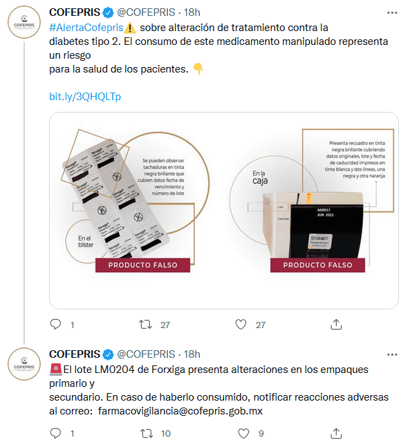 La Comisión Federal para la Protección contra Riesgos Sanitarios informó que Forxiga, medicamento para el control de glucosa en pacientes con diabetes mellitus tipo 2, en el lote LM0204 tiene alteraciones en los empaques primario y secundario.Detalló que la farmacéutica AztraZeneca, titular del registro sanitario de Forxiga, manifestó que la alteración se realizó sobre el lote LM0204, cuyo vencimiento fue en agosto de 2021; datos que fueron cubiertos para colocar la denominación MJ0017 con la caducidad falsa de junio 2022.Explicó que los empaques, primario y secundario, presentan tachaduras en tinta negra brillante que cubren datos originales, fecha de vencimiento y lote.El consumo de este producto manipulado es un riesgo a la salud, por lo que Cofepris pone a disposición el correo farmacovigilancia@cofepris.gob.mx, para notificar reacciones adversas.OA