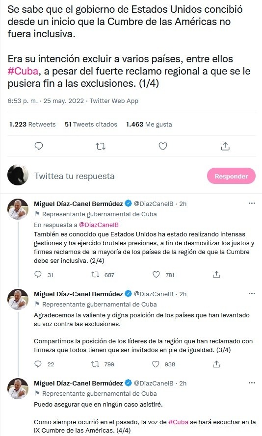 El presidente de Cuba, Miguel Díaz-Canel, aseguró este miércoles que "en ningún caso" asistirá a la controvertida Cumbre de las Américas de Los Ángeles a la que Washington aún no lo ha invitado."Se sabe que el Gobierno de Estados Unidos concibió desde un inicio que la Cumbre de las Américas no fuera inclusiva. Era su intención excluir a varios países, entre ellos Cuba, a pesar del fuerte reclamo regional a que se le pusiera fin a las exclusiones", escribió el mandatario en Twitter.Estados Unidos comenzó a enviar las invitaciones desde la semana pasada, pero hasta el momento no ha trascendido si cedió ante los reclamos de gobiernos de la región como México, Chile, Bolivia, Argentina y Guatemala para incluir a Cuba, Venezuela y Nicaragua.Washington dijo en un principio que no pensaba invitar a estos países porque no respetaban la democracia.La Casa Blanca llegó a barajar la posibilidad de que asistiera una representación de la isla, pero que ésta no se tratara ni del ministro de Exteriores, Bruno Rodríguez ni del presidente Díaz-Canel.El Presidente Andrés Manuel López Obrador, llegó a afirmar, días después de visitar Cuba, que si se excluía a Managua, La Habana y Caracas no asistiría a la reunión.En los días posteriores, los presidentes de Bolivia y Guatemala, Luis Arce y Alejandro Gianmattei, respectivamente, también señalaron que no harían acto de presencia si había excluidos."Agradecemos la valiente y digna posición de los países que han levantado su voz contra las exclusiones. Compartimos la posición de los líderes de la región que han reclamado con firmeza que todos tienen que ser invitados en pie de igualdad", continuó Díaz-Canel.Al cerrar un hilo con cuatro mensajes, el mandatario remató que, pese a su ausencia, "la voz de Cuba se hará escuchar en la IX Cumbre de las Américas".JM