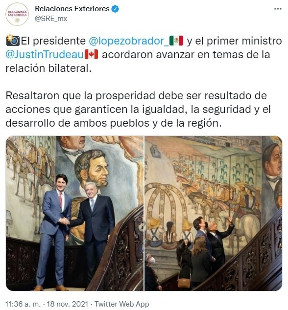 La primera reunión bilateral en el marco de la Cumbre de Líderes de América del Norte arrancó esta mañana entre el Presidente Andrés Manuel López Obrador (AMLO) y el primer ministro canadiense, Justin Trudeau, en la que se alcanzaron varios acuerdos.En la reunión en el Instituto Cultural México en Washington, Estados Unidos, acordaron avanzar en una integración económica más incluyente y reconciliación con los pueblos indígenas.Al finalizar el encuentro, la Secretaría de Relaciones Exteriores (SRE) informó destacó los siguientes puntos de avance:"Se buscará la reconciliación con los pueblos indígenas y poner a comunidades originarias en el centro de las políticas públicas, combate a la desigualdad a través de medidas de redistribución justa de la riqueza y promover la competitividad de la región".Roberto Velasco Álvarez, jefe de la Unidad para América del Norte de la SRE, dijo que coincidieron en la importancia de fortalecer la visión humanista de la relación bilateral"Avanzan hacia una integración económica más incluyente, en la que jóvenes, mujeres y comunidades indígenas se beneficien de una mayor cooperación bilateral a través de nuestros mecanismos e instituciones comunes, como la Alianza México-Canadá y el T-MEC", indicó en su cuenta de Twitter.Al llegar al encuentro en el Instituto Cultural México, ambos líderes se declararon "muy contentos" por la reunión, la primera presencial que sostienen desde que López Obrador asumió el cargo, en diciembre de 2018."Somos pueblos, naciones, hermanas que estamos muy cerca, pertenecemos a América del Norte y tenemos muchas cosas en común. Y lo más importante, una muy buena relación de cooperación y de amistad", destacó el mexicano.Trudeau señaló que existen muchos temas en común entre ambos países, como "los pueblos indígenas, las mujeres y el hecho de que somos grandes aliados".Afuera del Instituto, donde se encontraba López Obrador y su comitiva, incluyendo al canciller Marcelo Ebrard, la secretaria de Economía, Tatiana Clouthier, el embajador de México en Estados Unidos, Esteban Moctezuma, el secretario de Hacienda, Rogelio Ramírez de la O y el subsecretario de Salud, Hugo López Gatell, se reunieron simpatizantes de López Obrador. Un mariachi compuesto en su mayoría por niñas y mujeres entonó la canción de "El Rey", y el presidente saludó desde el balcón, previo a la llegada de Trudeau.Tras esta reunión bilateral, a las 13:30 horas locales (12:30 de la Ciudad de México) vendrá otra entre López Obrador y la vicepresidenta estadounidense Kamala Harris, en la Casa Blanca.Allí mismo, a las 15:00 horas locales (14:00 de la CDMX), será el encuentro bilateral entre el mandatario mexicano y su par estadounidense, Joe Biden. A las 17:00 horas locales (16:00 de la CDMX) está prevista la reunión trilateral entre Biden, López Obrador y Trudeau.Con información de SUNIM