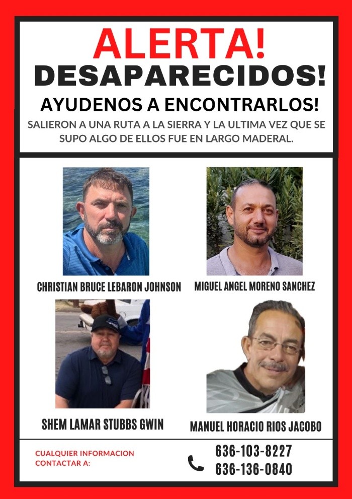 Adrián LeBaron, denunció la tarde de este lunes a través de su cuenta de X (antes Twitter), la desaparición de cuatro integrantes de su comunidad en el estado de Chihuahua.Se trata de Miguel Ángel Moreno Sánchez, Shem Lamar Stubbs Gwin, Manuel Horacio Ríos Jacob y Christian Bruce LeBaron Johnson.Hasta el momento se desconoce el paradero de las cuatro personas, quienes aparentemente salieron durante el domingo rumbo a la sierra al municipio de Madera, Chihuahua."Aquí nadie se esfuma, los vamos a encontrar y haremos lo que sea necesario. Los queremos con sus familias, en su comunidad. Dejemos de ser el país de desaparecidos", escribió Adrián LeBaron en su cuenta de X.De momento la Fiscalía General del Estado de Chihuahua no ha proporcionado información sobre la denuncia de la desaparición de los integrantes de la comunidad LeBaron.Por su parte, los integrantes de la comunidad pidieron a la gente de Galeana y de la región, si tienen información que los regrese, la hicieran saber a varios números que proporcionaron.Esta no es la primera vez que integrantes de la comunidad LeBaron desaparecen en Chihuahua o son víctimas del crimen organizado en la región noroeste y sur del estado.En noviembre del 2023 se reportó la desaparición de una integrante de la familia en el municipio de Nuevo Casas Grandes, quien fue víctima de extorsión y apareció horas después sana en ese mismo municipio.Cabe destacar que en el municipio de Madera se han reportado varios enfrentamientos armados en las últimas semanas, por la lucha que viven grupos del crimen organizado por la tala clandestina y el control de la región.NA
