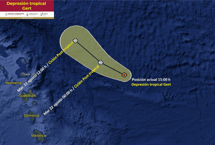 En el Océano Atlántico se forman fenómenos naturales que podrían afectar al territorio nacional, es por eso que el Servicio Meteorológico Nacional (SMN), fuente oficial del Gobierno de México en materia climática, mantiene una constante vigilancia por las posibles afectaciones que podría tener el país; como sucede con la depresión tropical "Gert".Esta mañana de martes, el SMN informó que "Gert" ahora tiene la categoría de depresión tropical en el Atlántico Central, al este de las Antillas Menores, pero no afecta a costas mexicanas.Según la información que se proporcionó, "Gert" se encuentra a 605 al este de las Antillas Menores y a 3 mil 110 km al este de Cancún, Quintana Roo, en su distancia al lugar más cercano.No te pierdas: Esta es la ubicación de la tormenta tropical "Harold" y así afectará a MéxicoEl sistema se desplaza hacia el oeste-noroeste (290°) a 11 km/h y mantiene vientos máximos sostenidos de 45 km/h y rachas de 65 km/h.Con información del Servicio Meteorológico NacionalOA